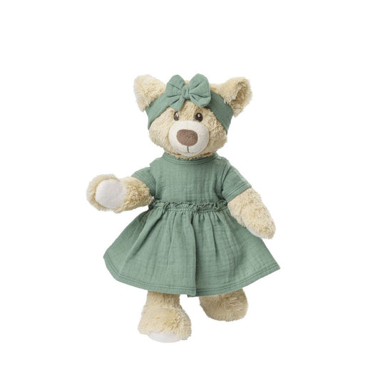 Heless Puppenkleid aus 100 % Bio-Baumwolle mit Rüschen und Haarband, salbeigrün, 2-teilig, Gr. 28-35 cm