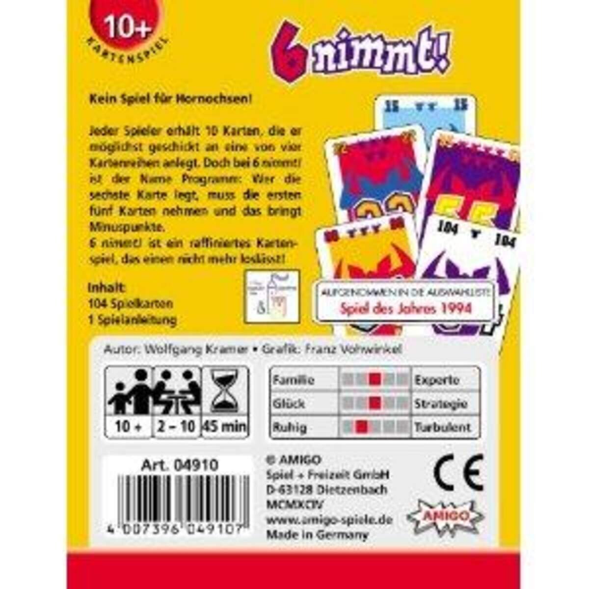 6 nimmt! Kein Spiel für Hornochsen. Jeder Spieler erhält 10 Karten, die er möglichst schlau an eine von vier Kartenreihen anlegt. Wer die sechste Karte in eine Reihe legt, muss die ersten fünf Karten nehmen. Und das ist schlecht für die Bilanz, das bringt nämlich Minuspunkte. 6 nimmt! ist ein raffiniertes Kartenspiel, das einen nicht mehr loslässt. Einfach und schnell gelernt. Mit einem Wort: genial.
