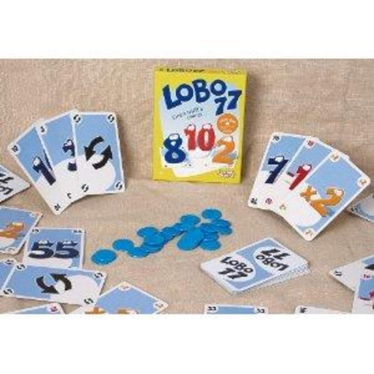 Lobo 77. Überarbeitete Neuauflage, 2008. Einer ist immer der Dumme... Karte für Karte wird auf dem Stapel abgelegt. Die Werte werden aufaddiert. Immer höher und höher klettert der Wert unaufhaltsam und die Spannung steigt. Bloß die 77 nicht erreichen, sonst sieht's trübe aus. Da gilt es, die vorhandenen Aktionskarten klug einzusetzen und das Unvermeidliche hinauszuzögern. Denn eines ist gewiss: Einer ist immer der Dumme ...
