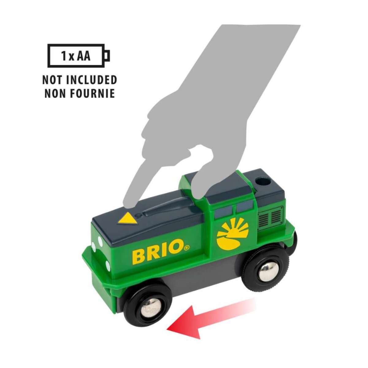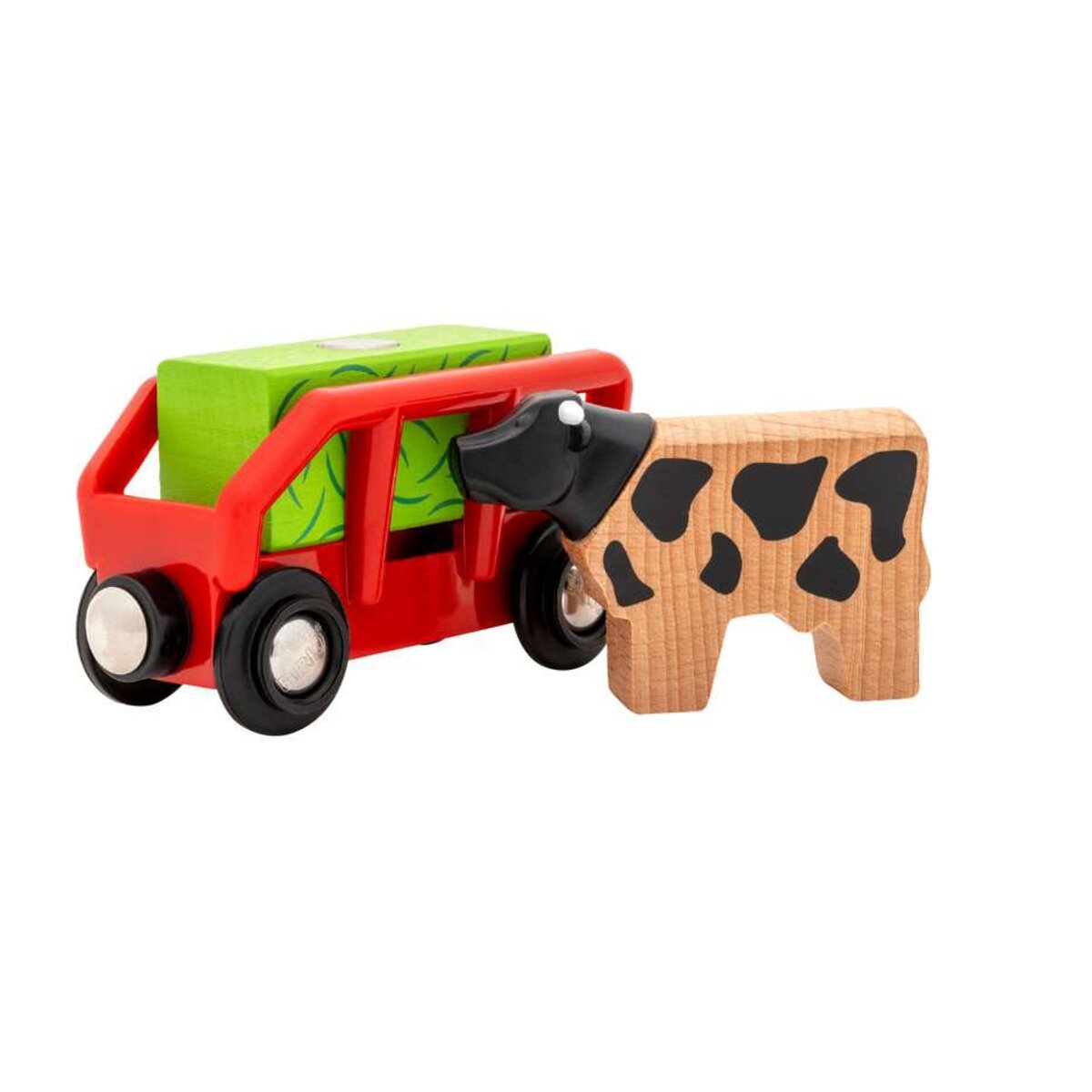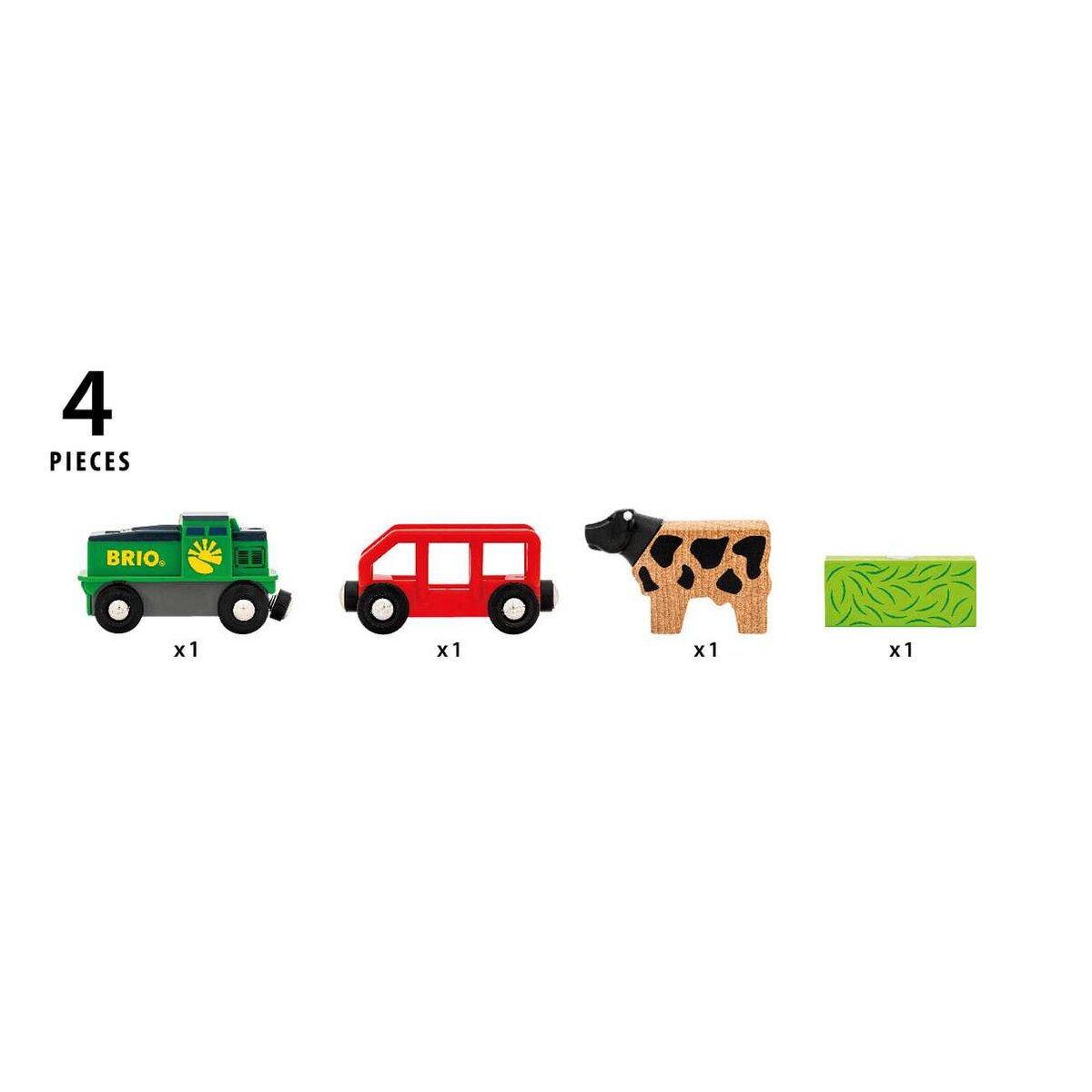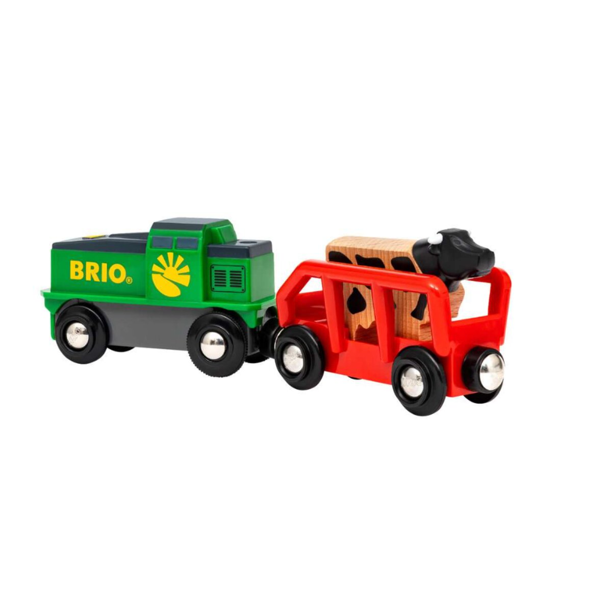 Bring die Tiere auf die Weide mit der Bauernhof-Batterielok. Diese batteriebetriebene Spielzeuglok wurde für Kleinkinder entwickelt und ist durch die einfache, altersgerechte Antipp-Funktion leicht zu bedienen. Tippe einfach vorne auf die Lok, um sie in Bewegung zu setzen und bringe sie durch erneutes Antippen zum Stehen. Stelle entweder die Holzkuh oder die Heuladung aus Holz auf den Anhänger und verbinde ihn mithilfe der Magnetkupplung mit der Spielzeuglok. Die Fahrt kann beginnen! Über BRIO World: Die BRIO World ist unser unbegrenztes Spielsystem, das mit deinem Kind mitwächst. Alle Spielzeuge der BRIO World passen zusammen und lassen sich zu einer Spielewelt kombinieren, die sich hervorragend eignet, um die kindliche Entwicklung zu fördern. Endlose fantasievolle Spielmöglichkeiten warten nur darauf, von dir entdeckt zu werden. Der 36018 Batterie-Bauernhofzug besteht aus 4 Teilen: 1 x batteriebetriebene Lok, 1 x Frachtwaggon, 1 x Holzkuh, 1 x Heuladung aus Holz