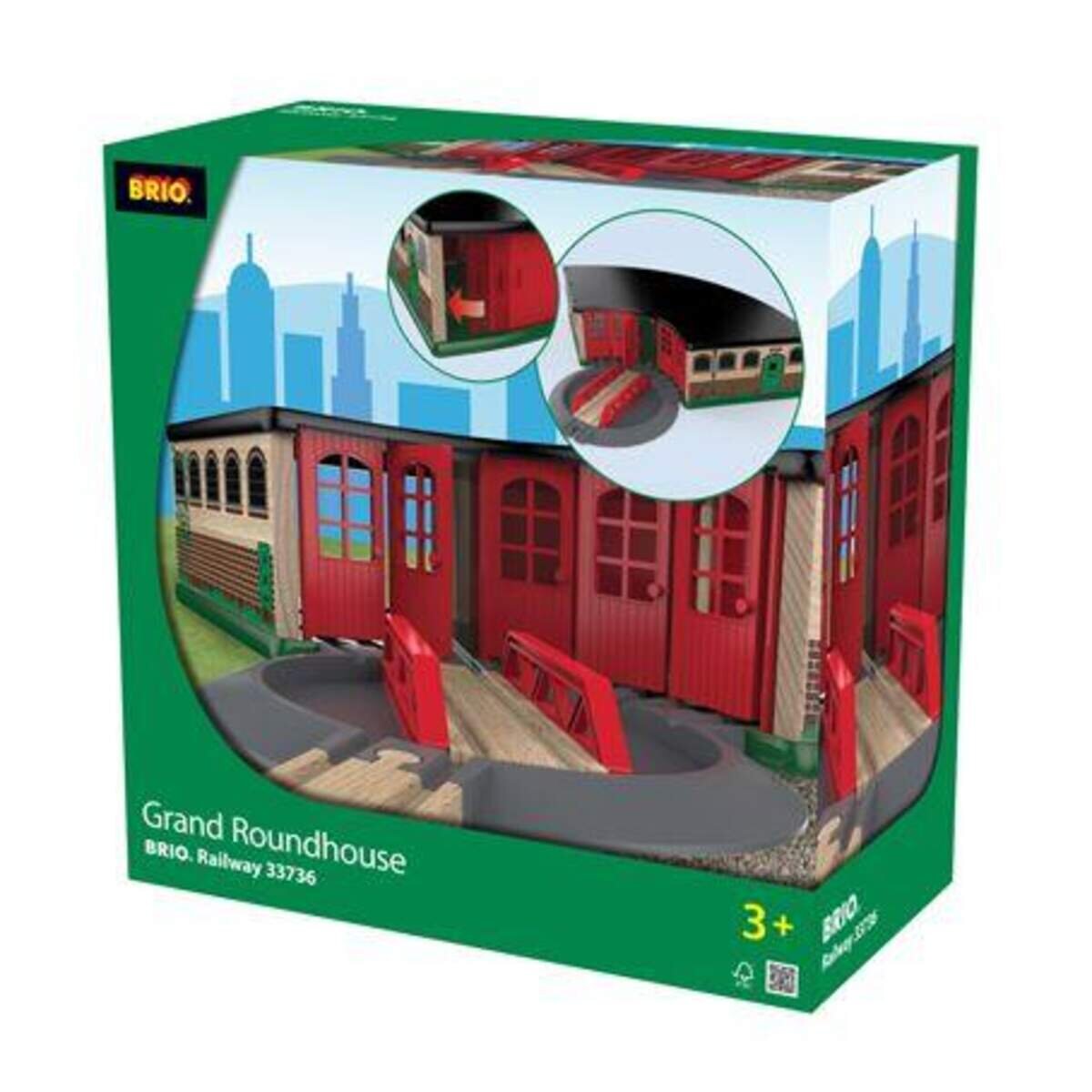 Wo werden die Züge abgestellt? Im großen Ringlokschuppen natürlich! Nimm die Drehscheibe, um die Züge gleich auf ihre individuellen Plätze zu stellen. Die hinteren Türen können geöffnet werden, was das Durchfahren von der Rückseite ebenso ermöglicht. Es passen fünf Fahrzeuge hinein und eine drehbare Weiche ist außerdem enthalten.