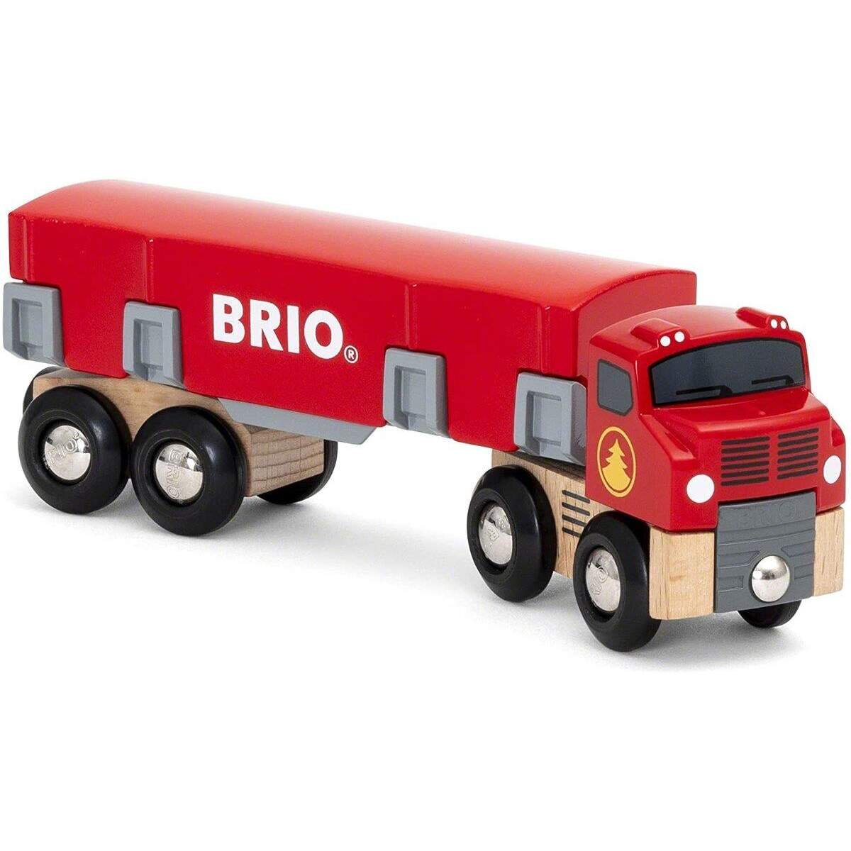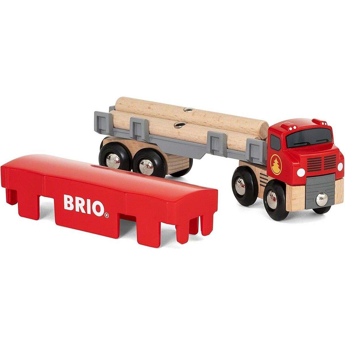 Der Holztransporter ist bereit, einige schwere Lasten durch die BRIO World zu transportieren. Dieser lange rote Sattelschlepper mit abnehmbarem Anhänger verfügt über einen verborgenen Motor, der bei nach vorne gekippter Sattelschlepperkabine zu finden ist, sowie über die serienmäßige BRIO-Magnetkupplung, die eine Verbindung zu anderen BRIO World-Wagen herstellen kann. Hebt man die rote Anhängerabdeckung ab, kommt man an die drei sicher darunter gelagerten Baumstämme. Diese sind mit jeweils einem Metallstift für die Verbindung mit einem Magnetkran der BRIO World ausgestattet. Das reale Eisenbahnspiel hilft Kindern, ihre Umwelt auf spielerische Weise zu verstehen und kennenzulernen, und fördert gleichzeitig die Feinmotorik
