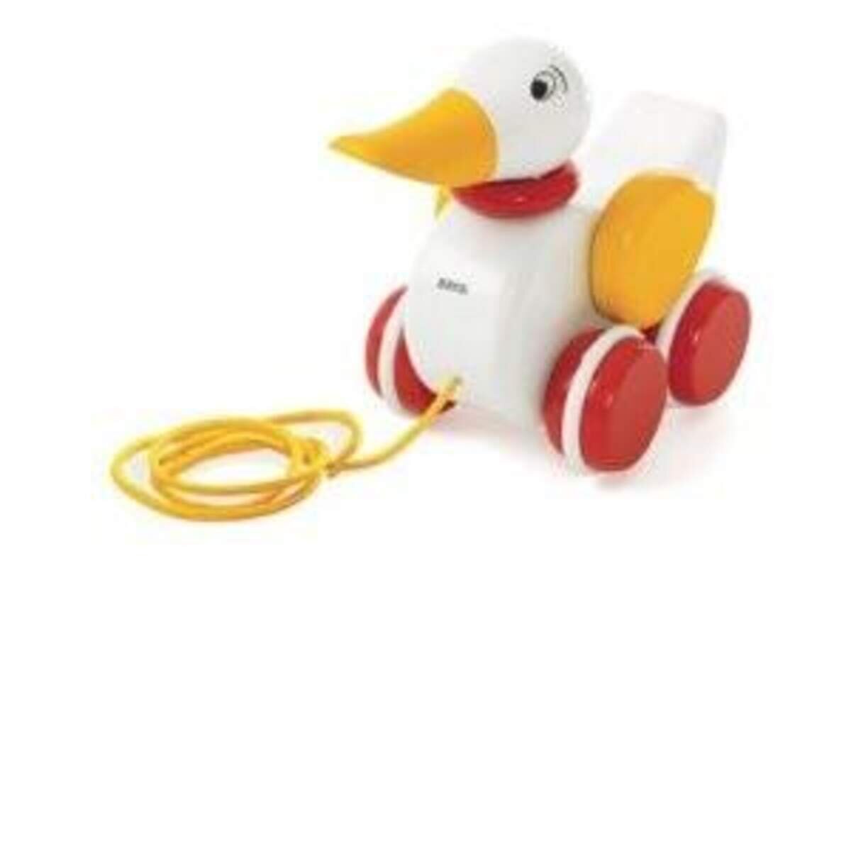 Mit der niedlichen weiß-rot-gelben Ente aus hochwertigem Buchenholz bekommen der BRIO Nachziehdackel, die Nachziehameise und die Kugelmaus jetzt Gesellschaft. Die 170mm kleine BRIONachziehente kann der Nachwuchs vorsichtig an der Leine durch die Wohnung führen. Damit baut er seinen Gleichgewichtssinn aus und lernt sicher einen Schritt vor den anderen zu setzen. Beim Nachziehen wackelt die Ente fröhlich mit dem Kopf, schlägt mit den Flügeln und signalisiert durch ein Quaken ihre Anwesenheit.