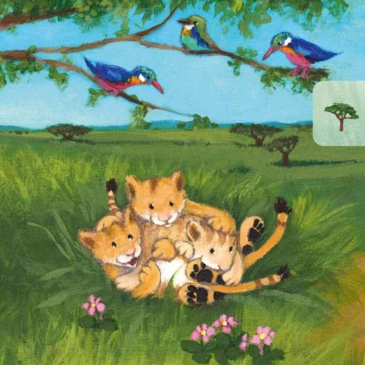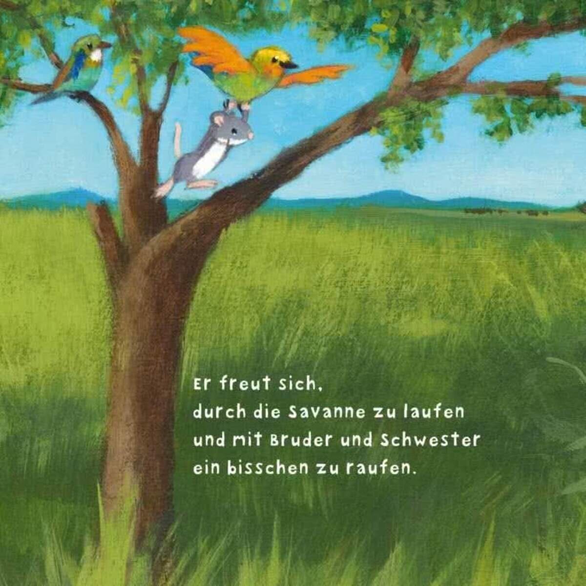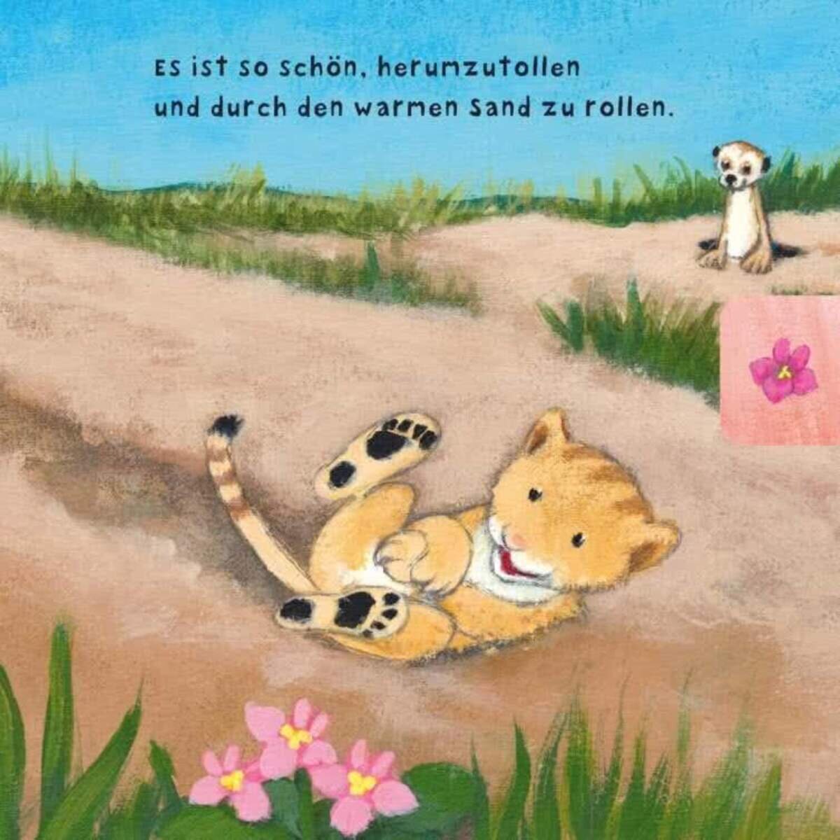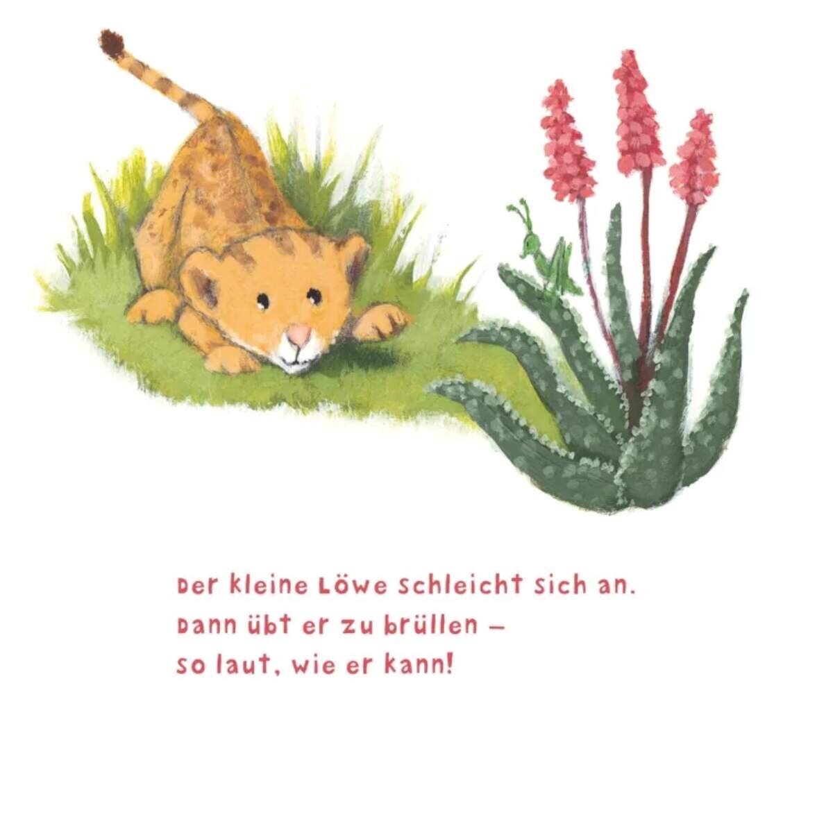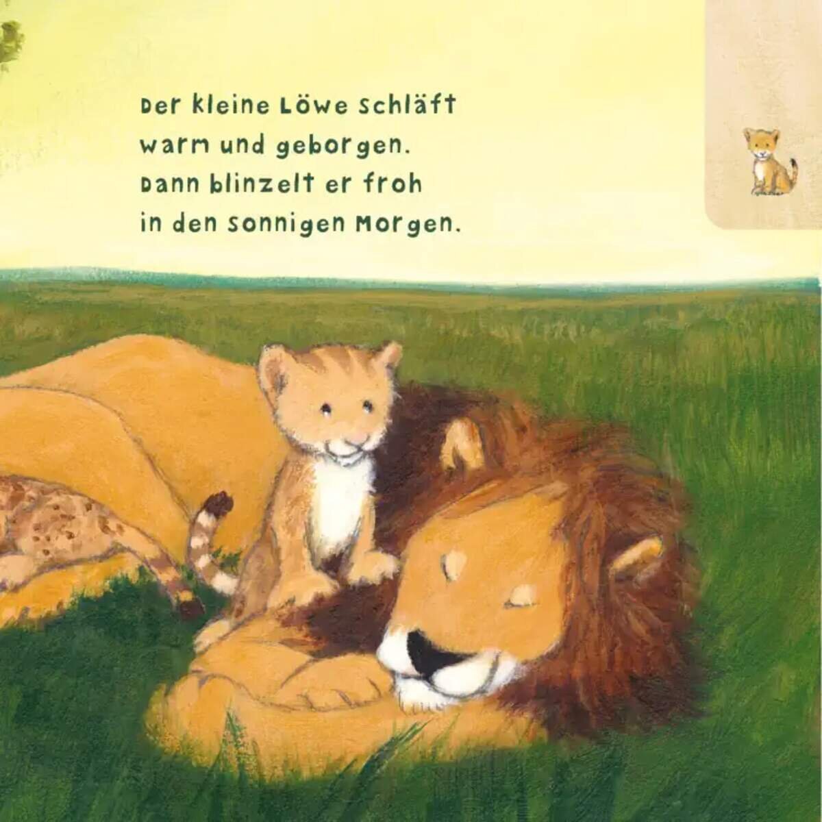 Der kleine Löwe hat einen aufregenden Tag vor sich: Er tobt mit seinen Geschwistern, übt lautes Brüllen und trifft neue Freunde – bis die Sonne untergeht und es Zeit für den Heimweg ist. Und wer wartet zu Hause schon auf ihn? Mit farbenfrohem Register als Blätterhilfe.