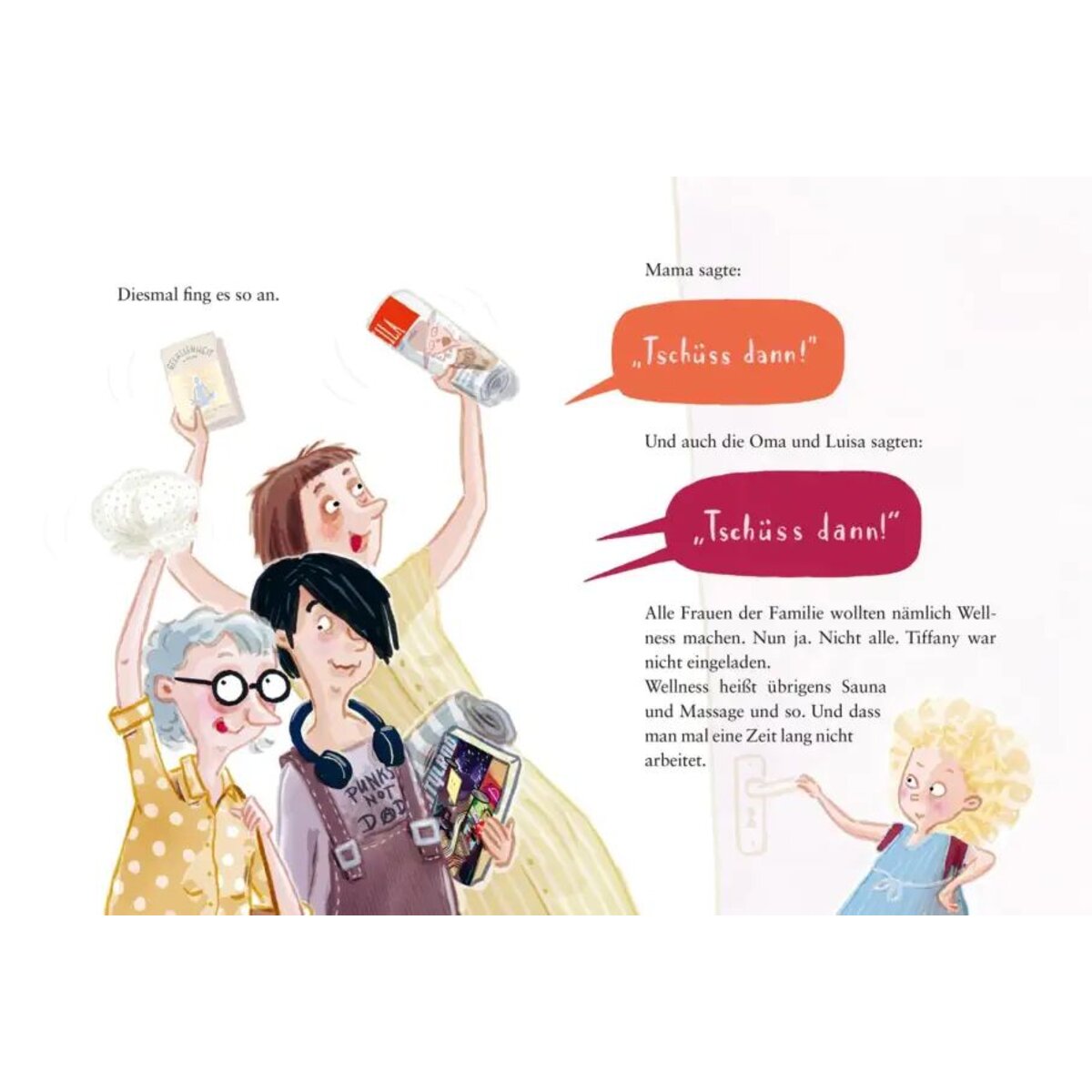 Mama, Luisa und die Oma wollen sich mal so richtig entspannen. Deswegen machen sie einen Wellness-Tag mit Sauna und so. Ohne Tiffany! Mit fremden, nackten Menschen in einem viel zu engen Raum sitzen, schwitzen und nicht reden? Das klingt für Tiffany nämlich wirklich nicht nach Spaß! Also bleibt sie bei Papa, Max und dem Opa zu Hause. Dort will sich auch Papa entspannen, aber daraus wird wohl nichts. Zuerst werden nur Papas Socken nass, doch irgendwann steht das ganze Bad unter Wasser. Ob die Schwungkraft oder vielleicht Angela Merkel daran Schuld haben und was die schlaue Waschmaschine dazu meint, davon handelt das neue Buch über Tiffany und ihre Familie.