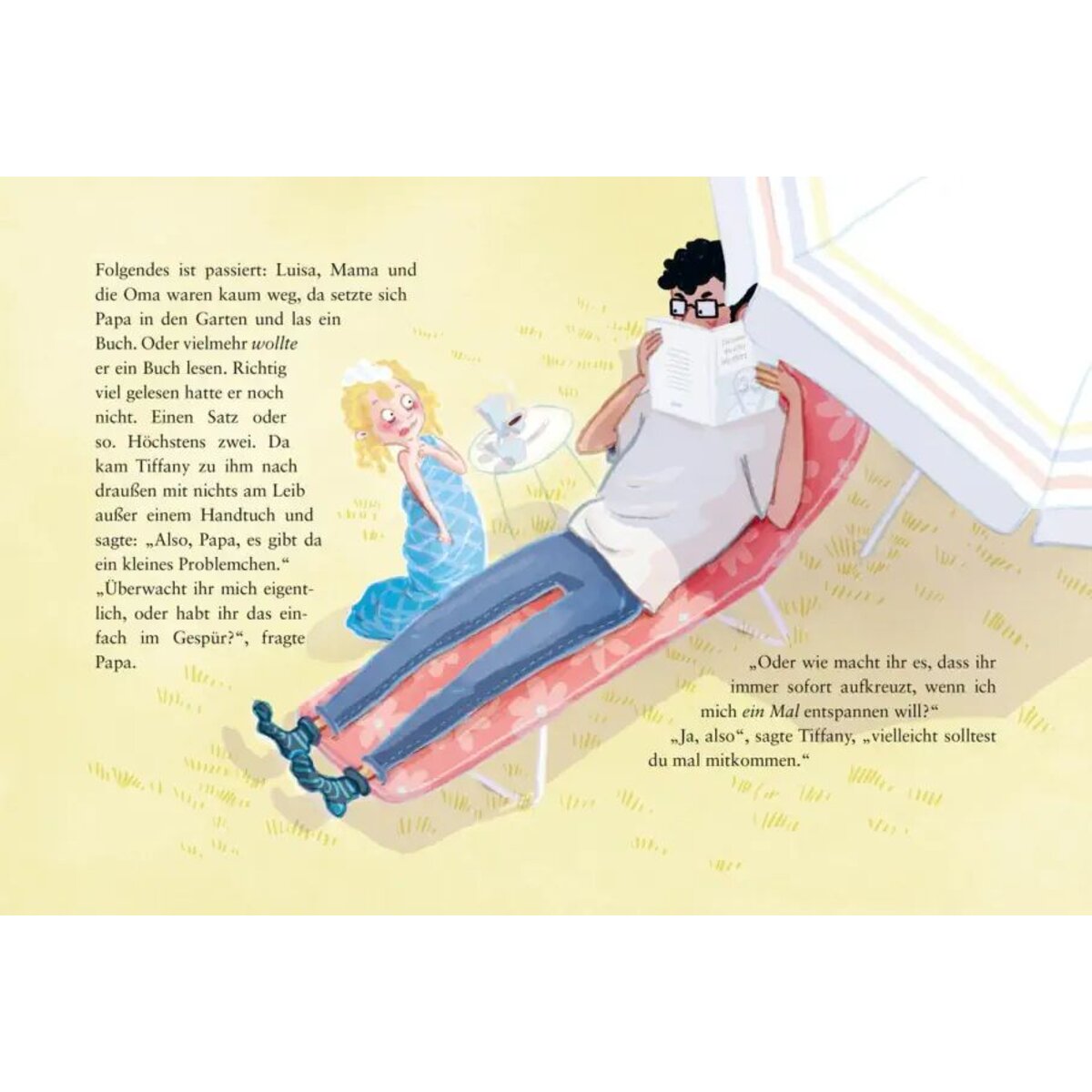 Luisa, Mama und die Oma waren kaum weg, da setzte sich Papa in den Garten und las ein Buch. Oder vielmehr wollte er ein Buch lesen. Richtig viel gelesen hatte er noch nicht. Einen Satz oder so. Höchstens zwei. Da kam Tiffany zu ihm nach draußen mit nichts am Leib außer einem Handtuch und sagte: „Also, Papa, es gibt da ein kleines Problemchen.“