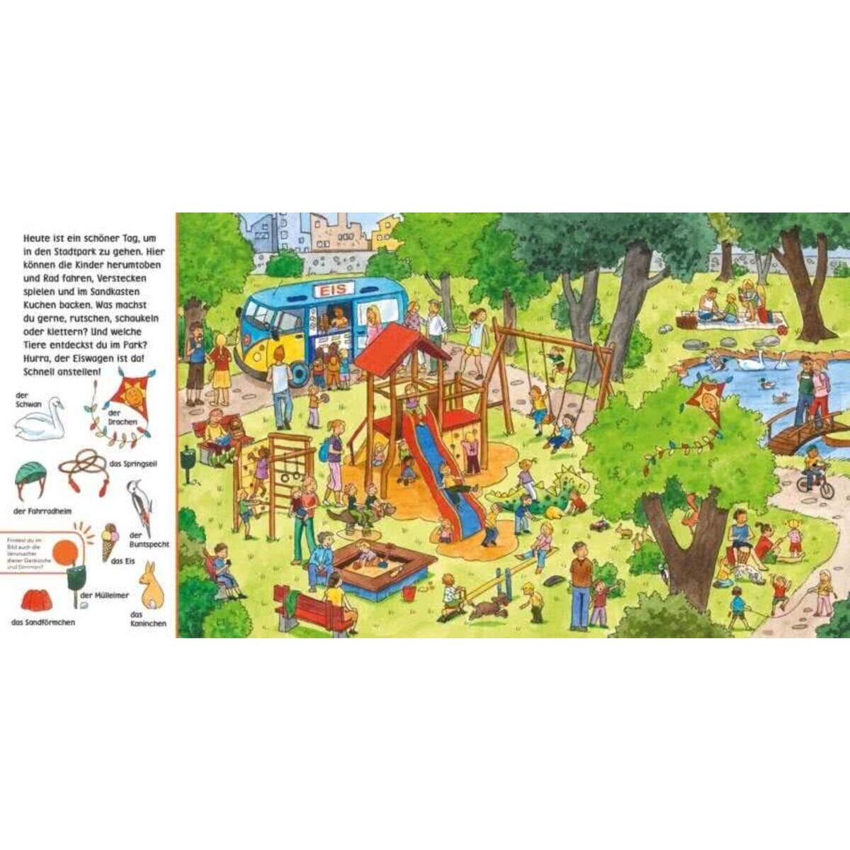 Wer spielt in der Fußgängerzone Klavier? Wer kauft ein Stück Käse am Marktstand? Welches Kind möchte kein Prinzessinnenkleid anziehen? Woher kommt das Hundegebell und die Polizeisirene? Wer saust gerade die Rutsche hinunter?