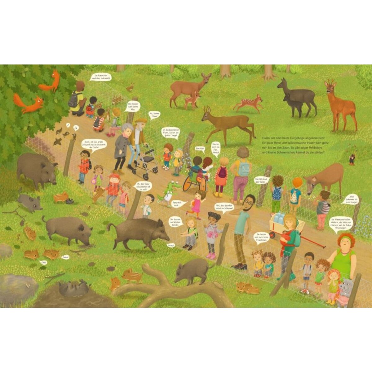 In diesem großen Pappbilderbuch rund um den Kita-Ausflug in den Wald wimmelt es von vielen wunderbaren Kindern – und überall gibt es unendlich viel zu entdecken. Wer hat Lust, die Kinder der Pinguin-Gruppe auf ihrem Ausflug in die Natur zu begleiten und spannende Waldbewohner zu entdecken? Findest du die Eichhörnchen, die Igel, den Fuchs und den Dachs? Kannst du dir die Namen der Kinder merken? Welche Kinder helfen der Försterin, neue junge Bäume zu pflanzen? Wer schläft unterwegs ein und wer klettert auf den Hochsitz? Und wer wird Wimmelbuchprofi und entdeckt den auf jeder Seite versteckten lustigen Maulwurf mit der roten Brille und die verlorenen einzelnen Schuhe?