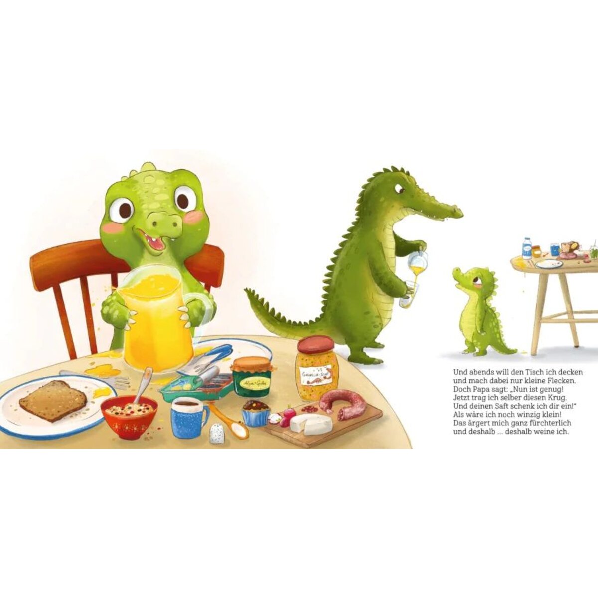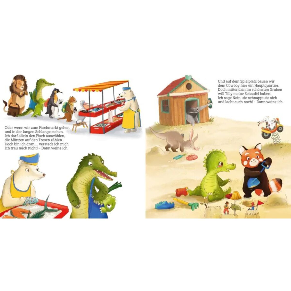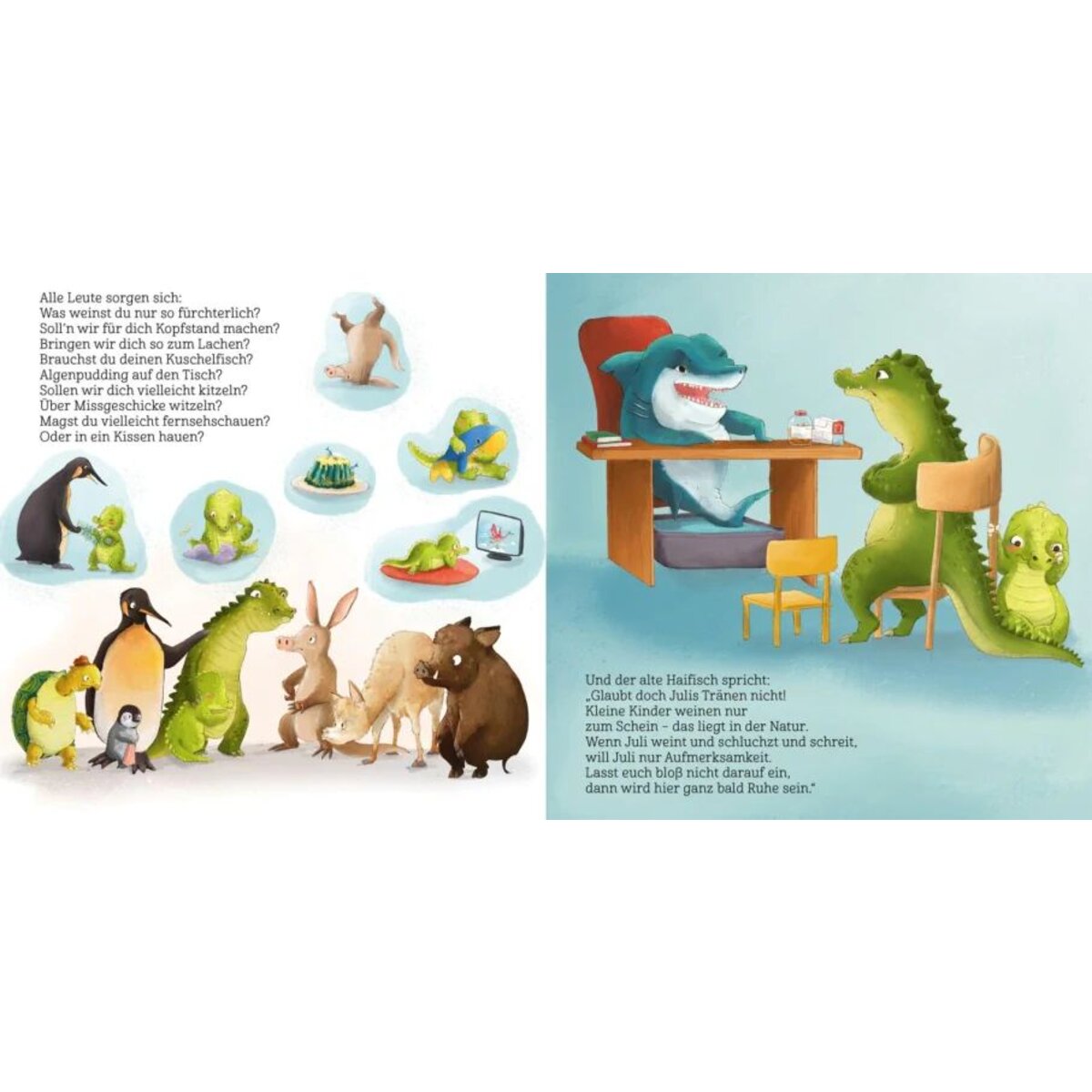 Ob bei Missgeschicken oder Übergängen, bei Angst und Wut, ja sogar bei Mitleid und purer Freude muss das kleine Krokodilkind oftmals weinen. Zum Glück ist Papa da und gibt Juli Zeit, Raum und Halt. Denn er weiß ganz genau, dass Tränen rollen, wie sie wollen und das kleine Krokodil ein Kuschelnest braucht, damit die Tränen mit der Zeit weniger werden können. Das Weinen ist für ein so wunderbar empfindsames Kind wie Juli ein wichtiges Ventil, um sein Erlebtes und Gefühltes zu verarbeiten.