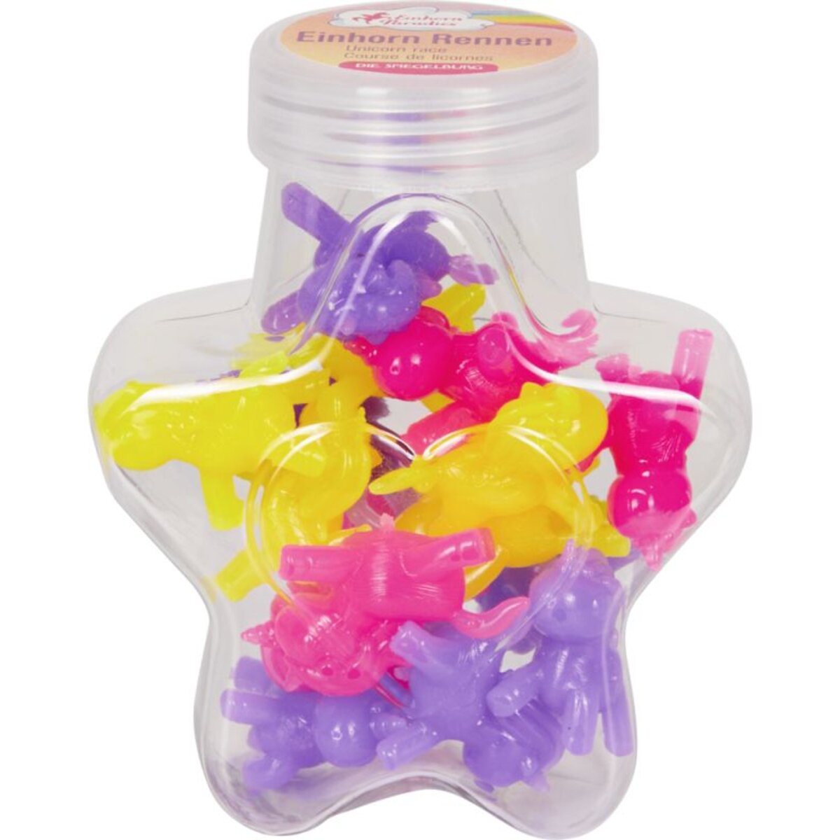 Willkommen im Einhorn-Paradies! Das Einhorn-Rennen ist ein Set aus 18 Einhörnern in 3 verschiedenen Farben. Fordere deine Freunde zum Einhorn-Duell! Die Spielidee ist einfach, aber spannend: Jeder Mitspieler lässt Einhörner einer bestimmten Farbe eine glatte Oberfläche herunterkrabbeln. Der Mitspieler, dessen Einhorn als Erstes den Boden erreicht, gewinnt das Wettrennen! Ein zauberhafter Zeitvertreib für echte Einhorn-Fans!