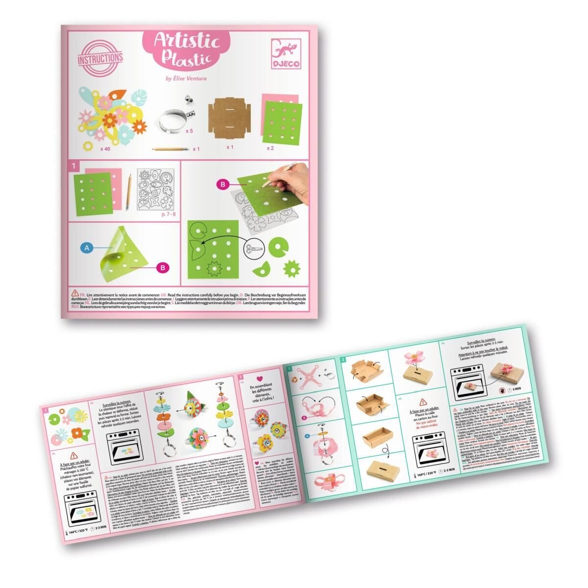 Inhalt: 2 Bögen farbiges Zauberplastik, 46 vorgeschnittene Formen aus Zauberplastik, 5 verstellbare Ringe, 1 Bleistift, 1 Kartonvorrichtung zum Aufstecken, 1 farbige Anleitung