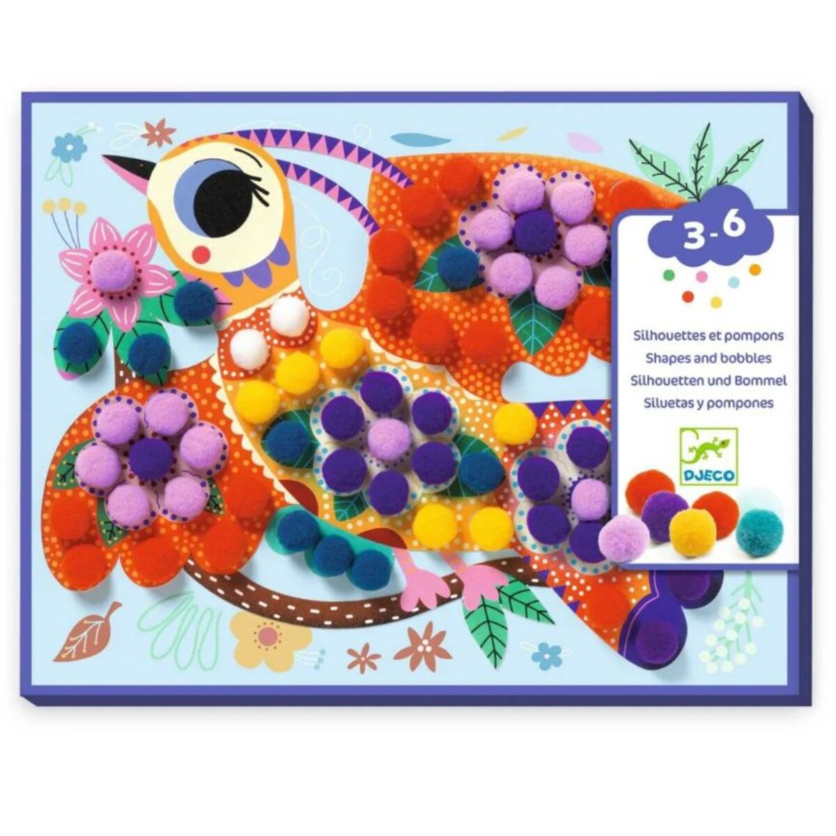- 3 Silhouetten von Vögeln aus dickem Karton mit selbstklebenden Bereichen, 200 zu klebende Bommel und 1 Schritt-für-Schritt-Anleitung.