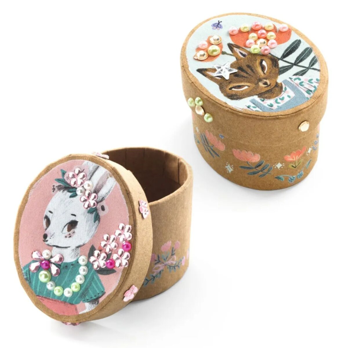 Ein Kreativset zum Erstellen von 5 zu dekorierenden Miniboxen mithilfe von über 200 selbstklebenden Edelsteinen. Genau das Richtige zum Verstauen seiner kleinen Schätze ... Verschönert das Kinderzimmer auf echt süße Art.