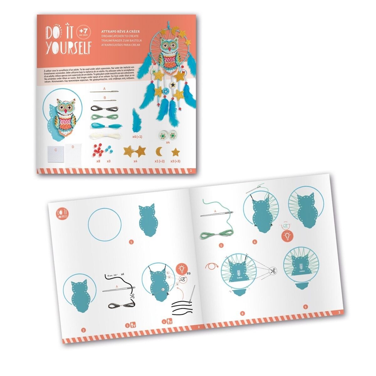 Ein umfangreiches Kreativset zum Basteln eines glitzernden Traumfängers, indem das Bild der Eule mit bunten Garnen, Perlen, Bändern und Federn verziert wird.