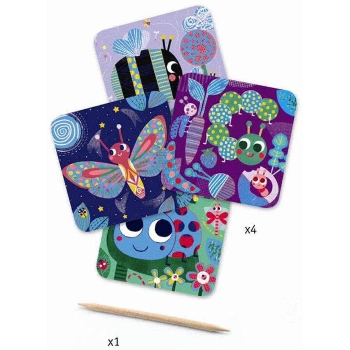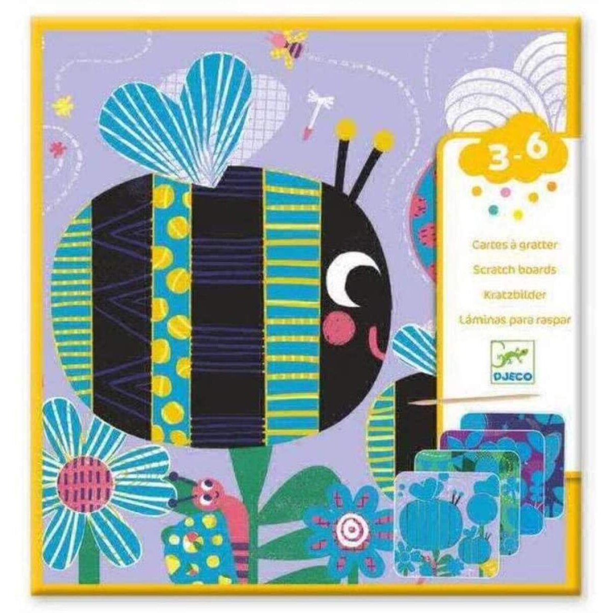 4 Kratzbilder mit einem abgerundeten Holzstab, geeignet für kleine Kinder. Mit dem Holzstab und dem Erklärungsheft kratzt das Kind die Oberfläche der Karte, um Muster zu bilden oder Überraschungen zu entdecken, was für ein Spaß! Und selbst wenn er, in seinem Impuls mitgerissen, alles zerkratzen will, wird das Ergebnis auch hübsch sein.