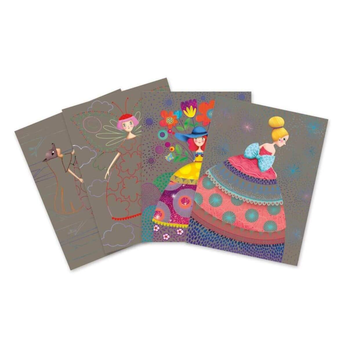 Ein Set mit 4 Kratzbildern, deren Bilder die funkelnden Outfits der abgebildeten Mädchen zum Vorschein bringen. Das Kind bildet die vom Künstler erdachten Motive nach. Hierzu kratzt es die Oberfläche mit Hilfe eines Holzstifts. Die Illustrationen werden Schritt für Schritt, wie von Zauberhand, freigelegt!