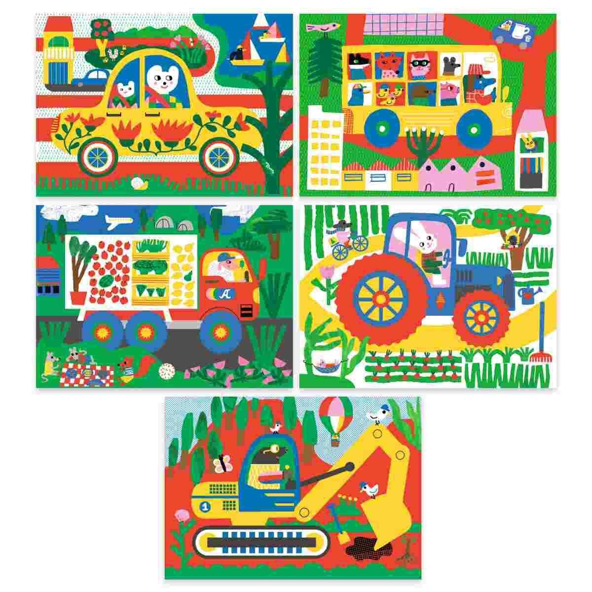 Für die Kleinen braucht man Fläche. Deshalb haben Sie hier fünf große Kratzbilder zum Thema Fahrzeuge mit einem großen Holzstab, der für jüngere Kinder ab 18 Monaten geeignet ist. Mit Hilfe der beiden Seiten des Holzstäbchens und der Schritt-für-Schritt-Anleitung kratzt das Kind die Oberfläche des Bildes ab, um Muster zu erzeugen oder Überraschungen zu entdecken. Was für ein Spaß! Selbst wenn das Kind voller Elan alles abkratzt, wird das Ergebnis sehr schön sein.