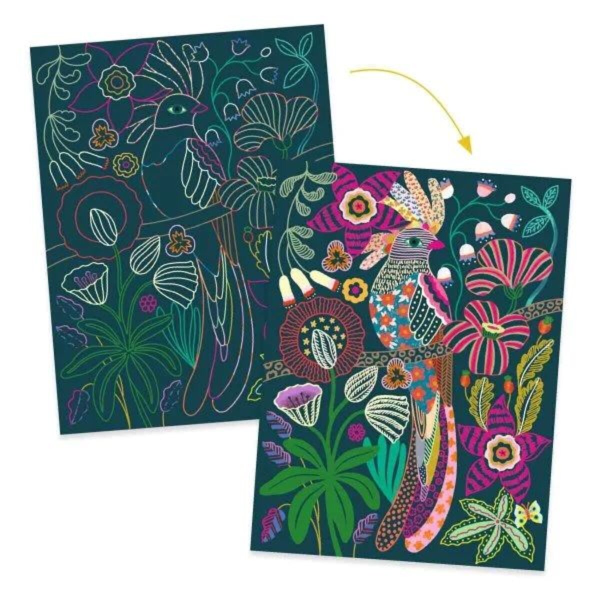 Ein Beutel mit 4 Rubbelbilder in Neonfarben in einer charmanten Atmosphäre. Das Kind bildet die vom Künstler erdachten Motive nach. Hierzu kratzt es die Oberfläche mit Hilfe eines Holzstifts. Die Bilder werden für Schritt für Schritt, wie von Zauberhand, freigelegt!
