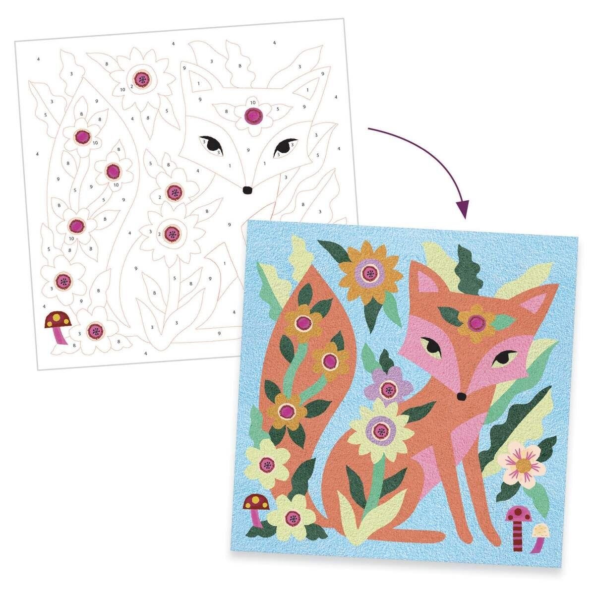4 Bilder mit nachtaktiven Tieren zum Kolorieren mit farbigem und phosphoreszierendem Sand. Das Kind legt sein Bild in die Box, deckt die vorgeklebten Flächen mit dem mitgelieferten Werkzeug auf und bestreut sie dann nach dem in der Anleitung angegebenen Farbcode mit Sand. Wenn die Bilder aufgestellt bzw. aufgehängt sind, erlebt man bei Einbruch der Dunkelheit eine Überraschung: Die Bilder leuchten im Dunkeln!
