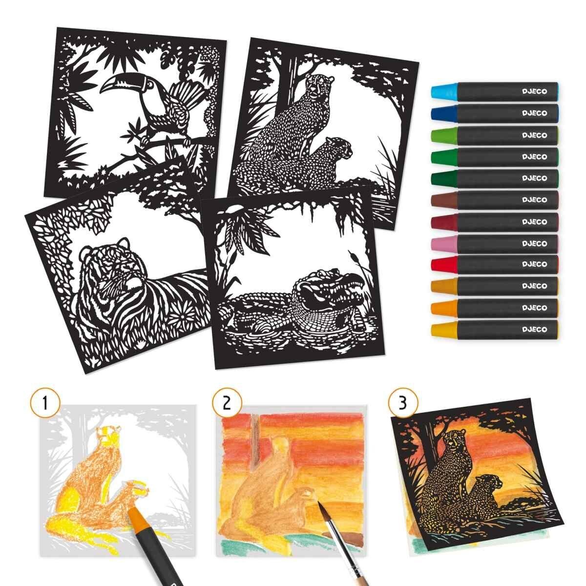 Das Aquarell-Atelier zum Thema wilde Tiere ist speziell für kleine Kinder im Alter von 6-10 Jahren entwickelt worden, um sie mühelos in die Aquarellmalerei einzuführen. Mit den beiliegenden Aquarell-Wachsstiften lernen die Kinder, hübsche Farbschattierungen zu erstellen: Sie tragen die Farben auf der Innenseite der Karte auf und verwischen sie anschließend mit dem feuchten Pinsel. Wenn das Kind seine künstlerische Arbeit beendet hat, kann es die Karte zuklappen, und die filigranen Elemente aus Papier heben sich im Gegenlicht des Himmels ab, was einen zauberhaften Effekt erzeugt.
