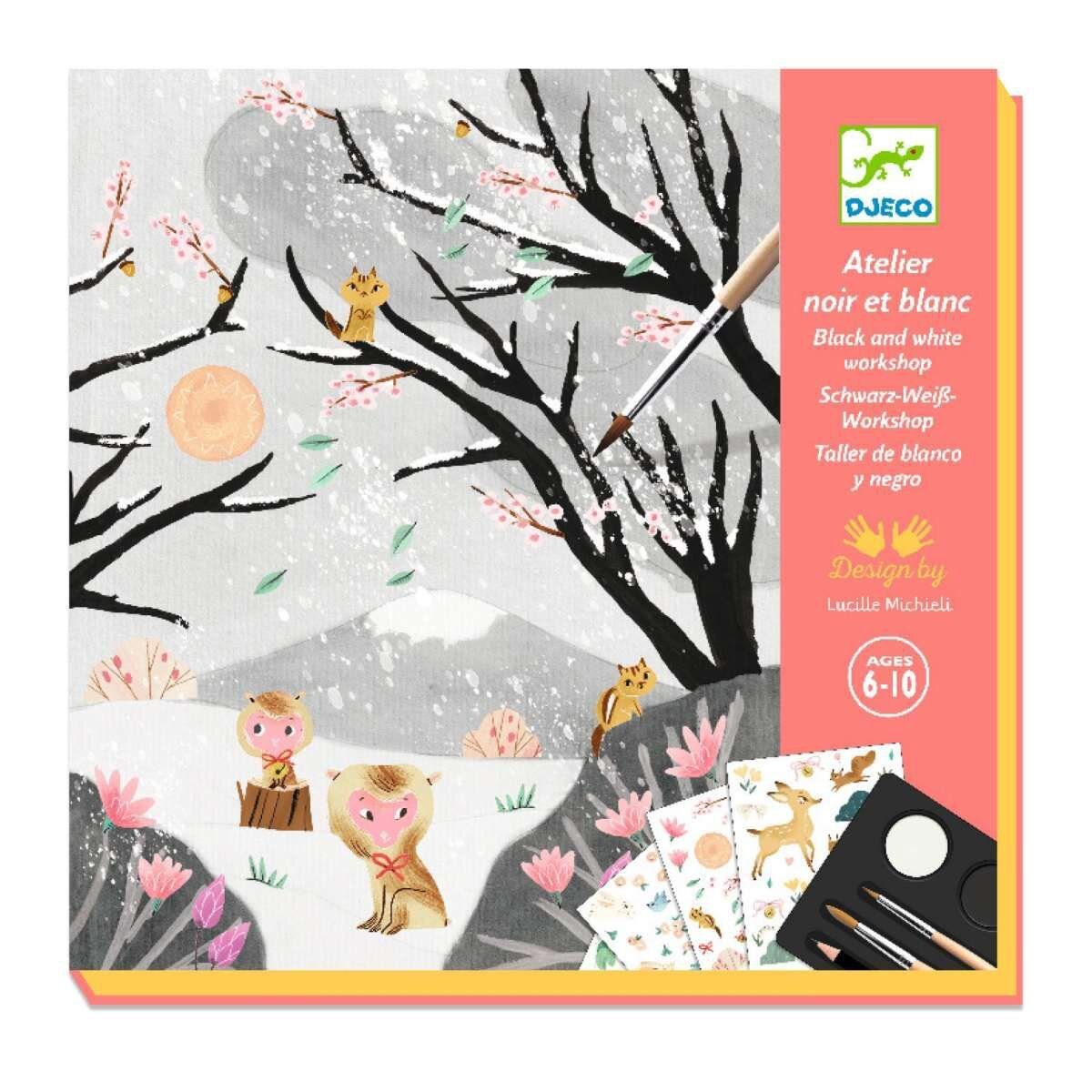 Eine von japanischen Drucken inspirierte Mal- und Collageaktivität mit 4 Bildern zum Dekorieren, um die Waschtechnik auf einfache Weise zu erlernen. Das Kind spielt mit zahlreichen Farbtönen zwischen Schwarz und Weiß und erstellt mit seinen Pinseln Landschaften, die es dann mit auf das Papier zu übertragenden Abziehbildern vervollständigt.