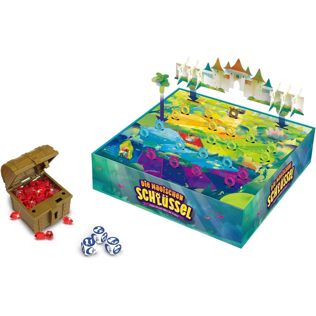 In diesem zauberhaften Kinderspiel würfeln sich 2-4 Spieler durch den magischen Schlüsselwald. In jedem Weg-Feld steckt zu Beginn ein Schlüssel - je weiter man in den Würfelwald eindringt, desto funkelnder die Belohnung. Der Weg durch den magischen Schlüsselwald birgt aber auch Risiken: Zeigen alle drei Würfel das Mond-Symbol, heißt es Gute Nacht und der Zug ist beendet. Wagt man also noch einen Würfelwurf oder versucht man sein Glück mit diesem Schlüssel? Manche Schlüssel öffnen die Truhe, andere wiederum passen nicht in das Schloss ... die Spannung steigt!