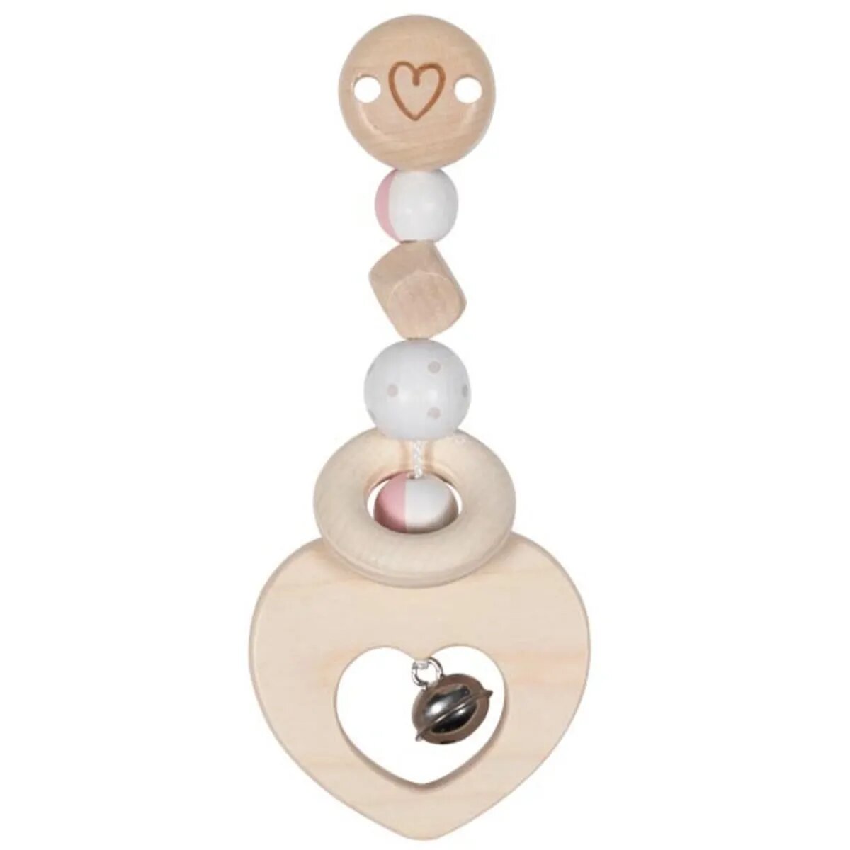 Die liebevoll gestaltete Clipfigur aus Holz mit Herz kann an Babybett, Kinderwagen oder Babyschale befestigt werden.
