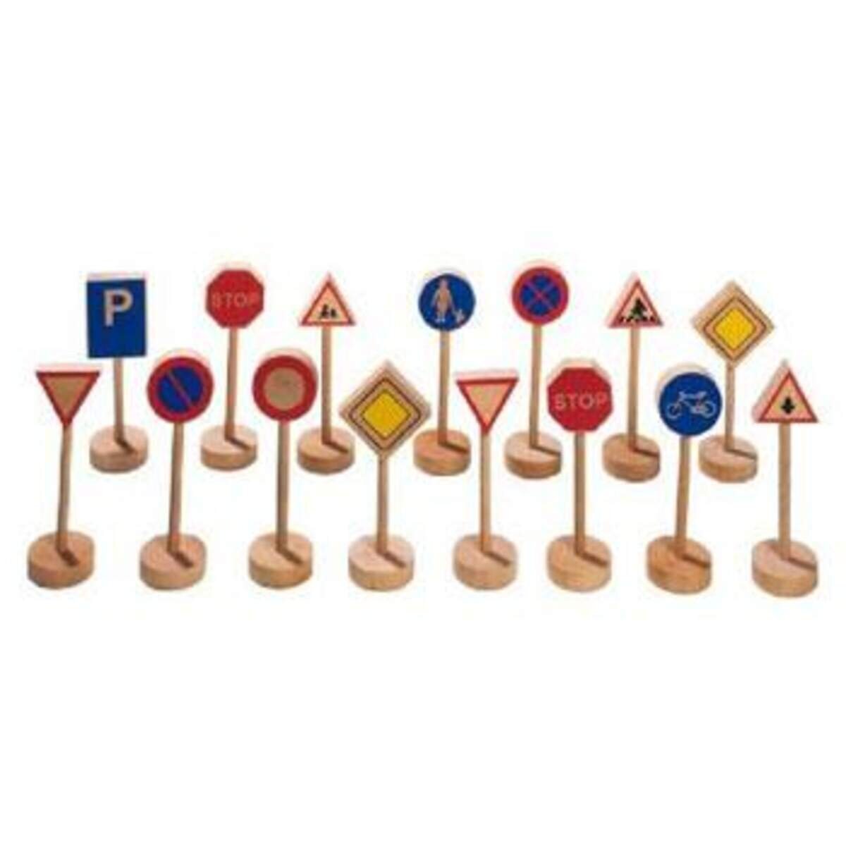 Verkehrszeichen aus stabilem Holz gearbeitet und teilweise bunt lackiert.