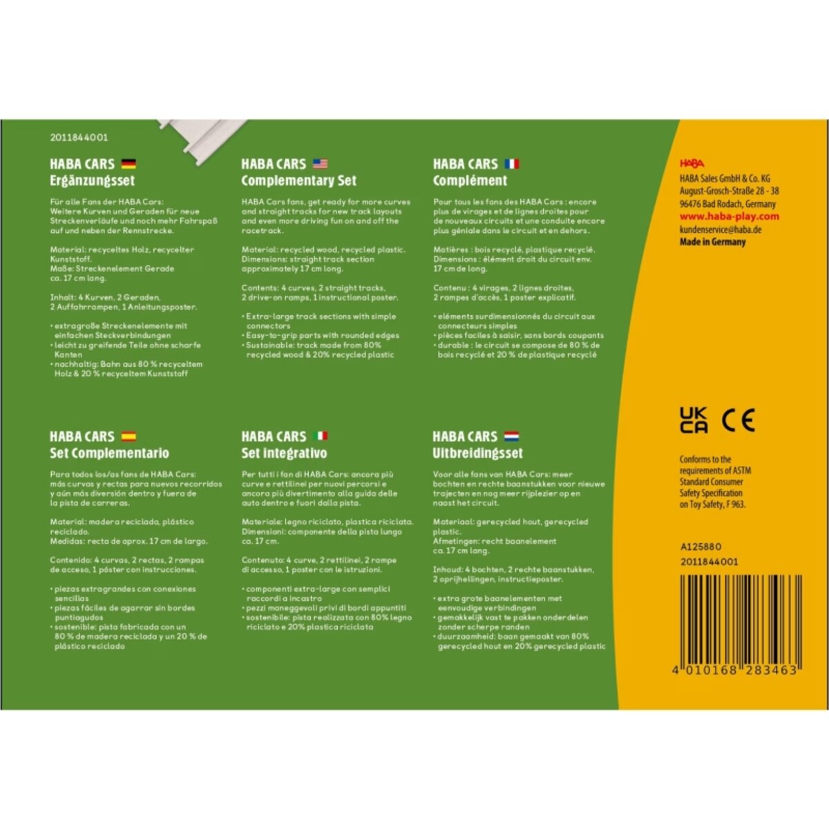 Für alle Fans der HABA Cars: Weitere 4 Kurven, 2 Geraden und 2 Auffahrrampen für neue Streckenverläufe und noch mehr Fahrspaß auf und neben der Rennstrecke.
