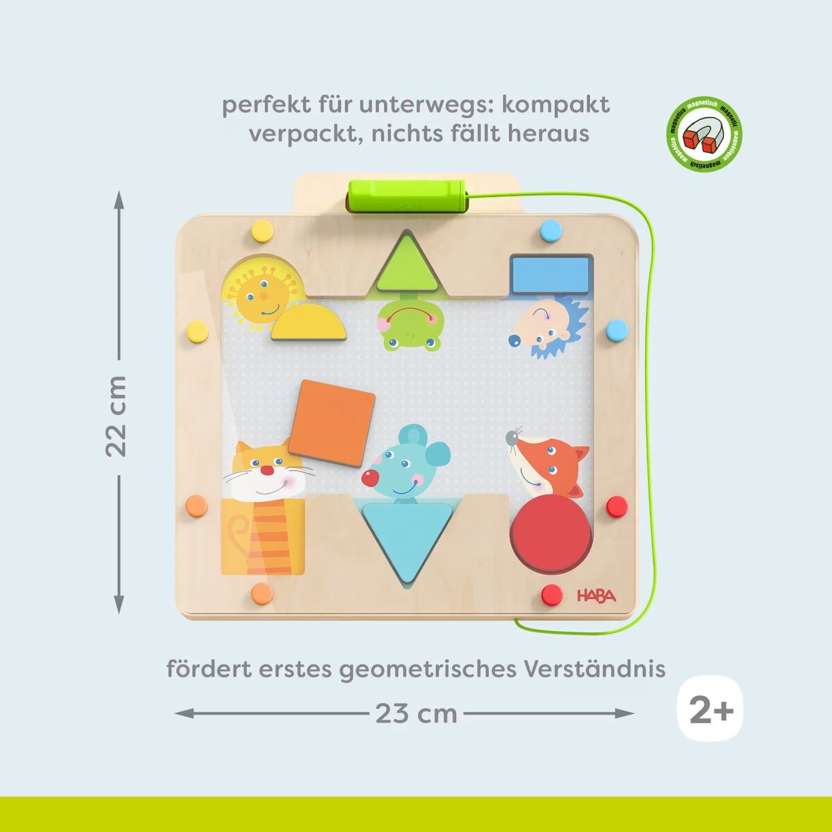 Die Tiere brauchen die Hilfe der Kinder, um ihre Körper zu finden. Dazu können die geometrischen Motivplättchen leicht mit dem Magnetstift an die jeweils richtige Stelle geschoben werden. Das Besondere: Die Zuordnung kann entweder nach passender Farbe oder nach passender Form erfolgen – denn es ist genug freie Fläche vorhanden, um die magnetischen Formen um 360° in jede beliebige Richtung zu drehen. Los geht’s!