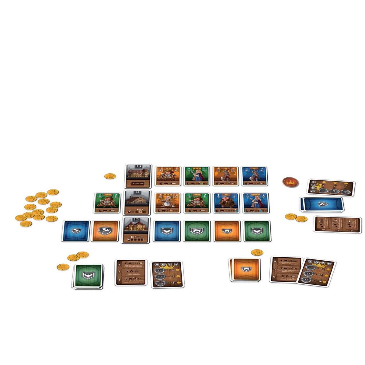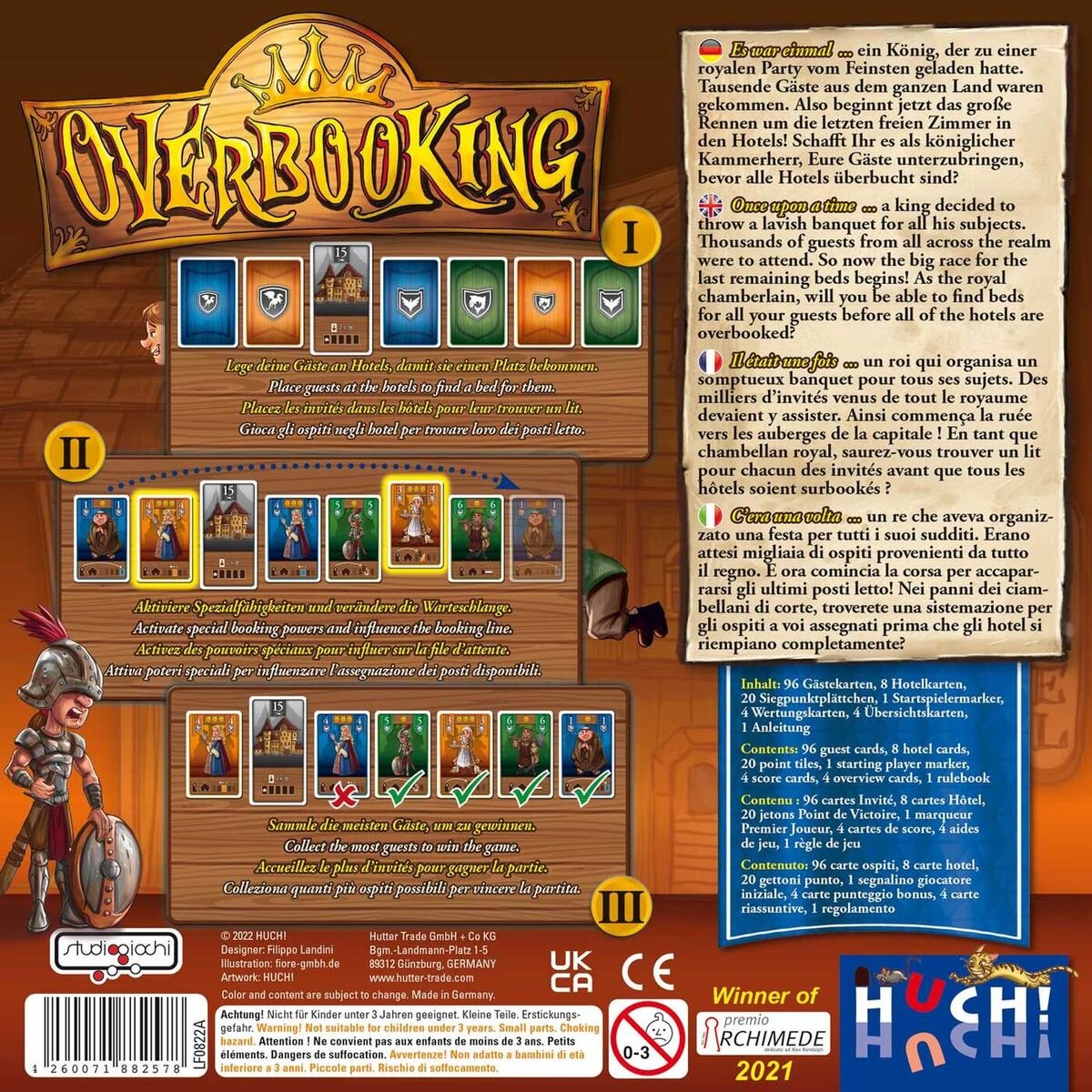 Es war einmal...ein König, der für seine Tochter eine royale Party vom Feinsten schmeißen wollte. Tausende Gäste aus dem ganzen Land waren geladen – fahrende Händler, Mönche, Soldaten und viele andere strömten in die Hauptstadt. Doch oh weh! Weil alle auf Last-Minute-Rabatte gehofft hatten, hatte niemand ein Hotelzimmer vorgebucht. Jetzt beginnt das große Rennen um die letzten freien Zimmer! Wer ergattert noch einen Schlafplatz, wer muss draußen bleiben und wer schafft es vielleicht noch mit einem fiesen Trick durch die Hintertür? Bei diesem kurzweiligen Spiel für die ganze Familie versucht jeder Spieler, seine Gästekarten in den wenigen Hotels unterzubringen und so Punkte zu sammeln. Aber Achtung: Jedes Hotel kann nur eine bestimmte Zahl an Gästen aufnehmen. Ihr müsst erahnen, wie viele Gäste die Gegner wohl ins Rennen um die Zimmer schicken und welche hinterlistigen Pläne sie schmieden, um euch in die Quere zu kommen.