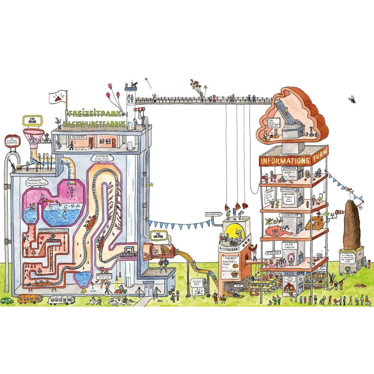 Unser Körper ist eine faszinierende Kackwurstfabrik auf zwei Beinen. Zusammen mit den Kindern Pim und Polly machen wir einen Rundgang durch diese Fabrik – vom Kontrollraum ganz oben über das Säurebad des Magens und die achterbahnartige Fahrt durch den Darm bis hinunter zu den Pförtnern des Enddarms. Wegen Überlastung und Verstopfung steht die Kackwurstfabrik allerdings kurz vor dem Aus. Pim und Polly sind fest entschlossen, sie zu retten. Am Bild einer Fabrik mit all ihren Abteilungen und Maschinen wird hier mit vielen lustigen Wimmelbildern und Info-Kästen erklärt, was bei der Verdauung passiert. Vom Bissen im Mund bis zur Wurst im Klo – eine spannende Werkbesichtigung unseres Verdauungsapparats