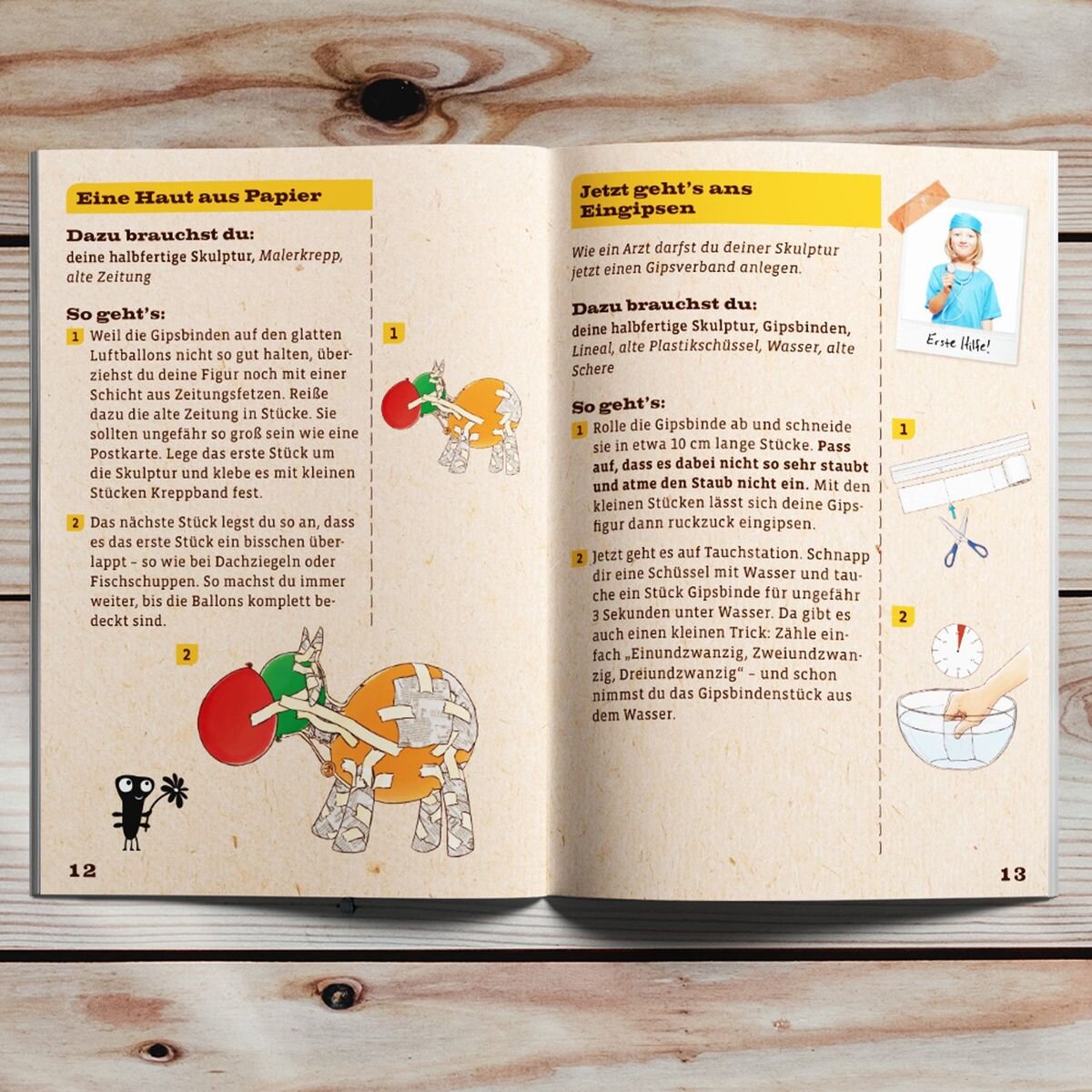 Hier kann man seiner Fantasie freien Lauf lassen und ein individuelles Kunstwerk erschaffen. Einfach aus Luftballons und Draht das Grundgerüst für die Skulptur bauen und mit Papier und Gipsbinden überziehen. So entsteht eine witzige, skurrile und einzigartige Figur, die mit den beiliegenden Wasserfarben nach Lust und Laune bemalt werden kann.