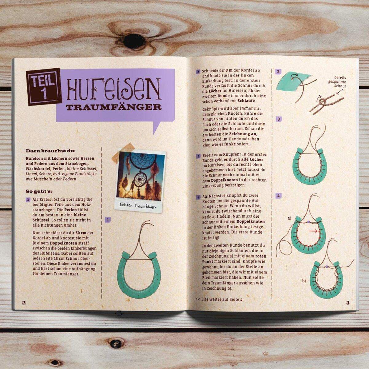 Das ist ein Traum für jeden Pferdeliebhaber. Insgesamt vier tolle Bastelprojekte rund ums Lieblingstier Pferd stecken in dieser Alleskönnerkiste. Kein Wunder, dass diese Kreativbox ein Muss ist – ob zum Geburtstag, als Mitbringsel oder als Bastel-Beschäftigung zwischendurch. Ein Traumfänger in Hufeisenform, pfiffige Schlüsselanhänger aus Filz, coole, geknüpfte Armbänder mit süßen silberfarbenen Anhängern und ein Hufeisen-Bilderrahmen – das ist die ideale Liebhaber-Ausstattung für kleine Pferdefans. Bastelspaß garantiert. Inhalt: 3 Filzplatten, Baumwollband, Glitzersteine, Wachskordel, Perlen, Nähgarn, Nähnadel, bedruckter Holzstanzbogen, 2 Anhänger für Armbänder, Anleitung (16 S.) Zusätzlich wird benötigt: flüssigen Bastelkleber, Transparentpapier, dünnen schwarzen Filzstift sowie weitere, haushaltsübliche Materialien.