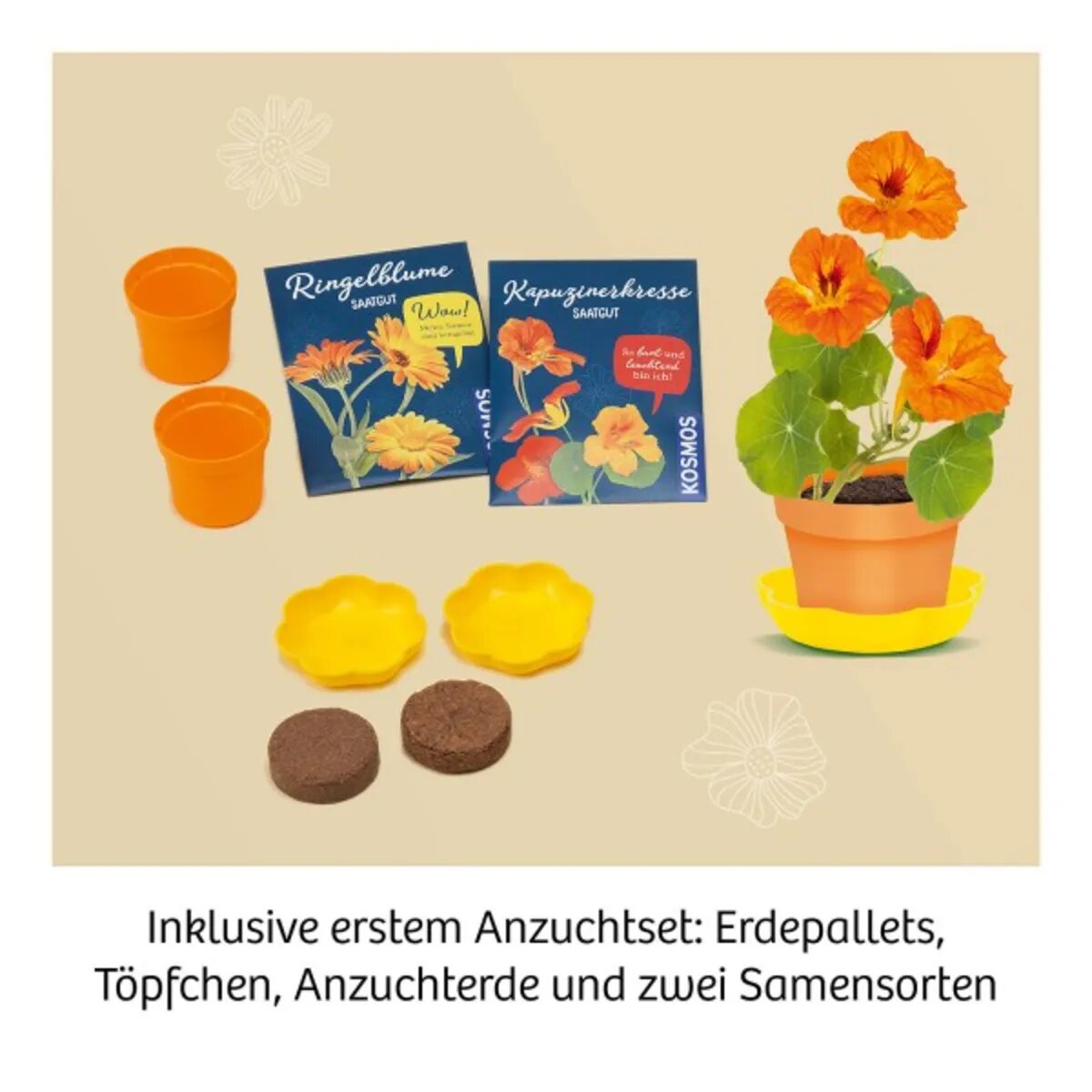 Bunte Blüten, die nie verwelken! Mit der handlichen Blütenpresse aus FSC-Holz entstehen aus Ringelblumen und Kapuzinerkresse wunderschöne Trockenblumen. Die Blumen werden dafür mit dem enthaltenen Anzucht-Set selbst herangezogen und anschließend gepresst. Ob blumige Grußkarten oder das erste selbst angelegte Pflanzen-Herbarium – für Kinder ein spannendes Projekt. Doch bevor die gepressten Blüten oder Blätter für Bastelprojekte genutzt werden, nehmen die Kinder die Pflanzen ganz genau unter die Lupe: Wie ist die Blüte aufgebaut und welche Strukturen hat ein Blatt? Die Anleitung erklärt die wichtigsten Details und zeigt, wie Pflanzen durch das Pressen haltbar gemacht werden. Und wer noch nicht genug hat, schnappt sich einfach die Blütenpresse und sammelt in der Natur weitere Pflanzen zum Pressen. Ein tolles Mitbringsel von KOSMOS.