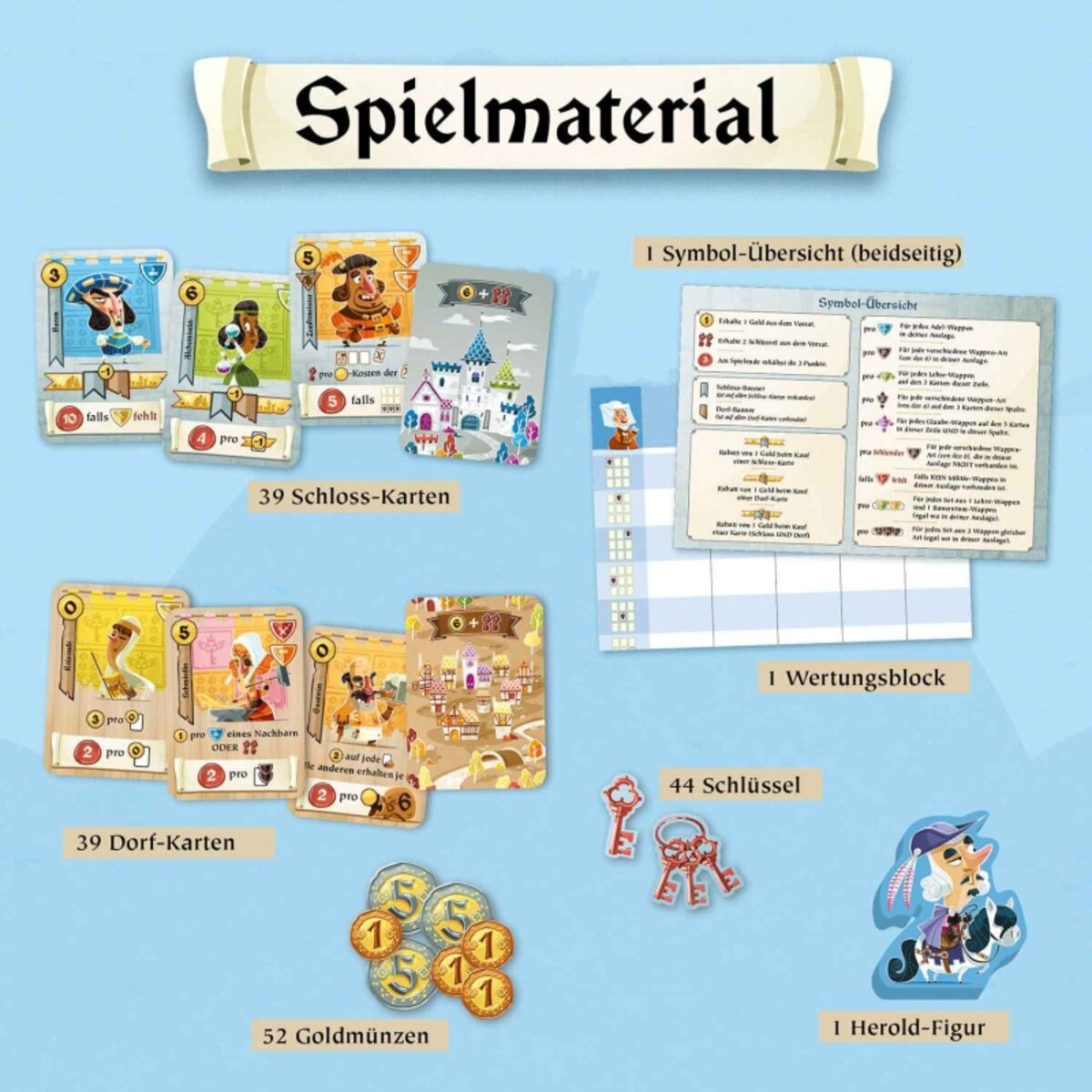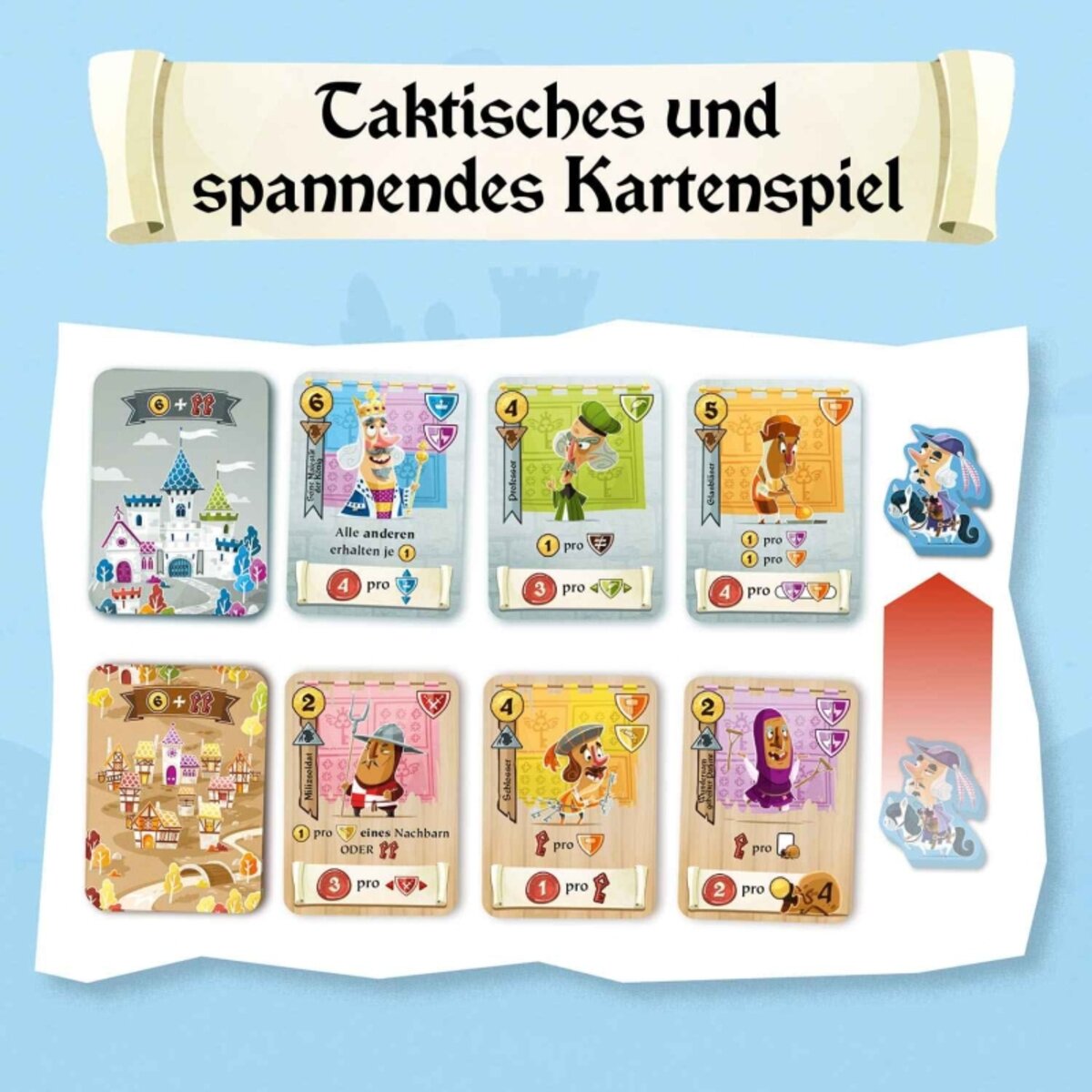 Ein Hofstaat will sorgfältig ausgesucht sein! Im taktischen Kartenspiel wählen die zwei bis fünf Spielerinnen und Spieler ab zehn Jahren Bewohner aus dem Dorf und der Stadt für ihre Auslage. Dadurch werden Kombo-Effekte ausgelöst: Es entstehen Sofort-Effekte und zudem geben die Charaktere je nach Positionierung Punkte. Diese kommen bei der Schlusswertung am Spielende zum Tragen. Die richtigen Entscheidungen auf dem Weg zur besten Kombo treffen und flexibel agieren: Möglichst viele verschiedene Symbole sammeln, Karten an spezifischen Positionen platzieren oder doch auf ganz andere Art und Weise vorgehen? Schnelles und taktisches Kartenspiel für Kenner. Auf der Empfehlungsliste zum 'Spiel des Jahres 2025'.