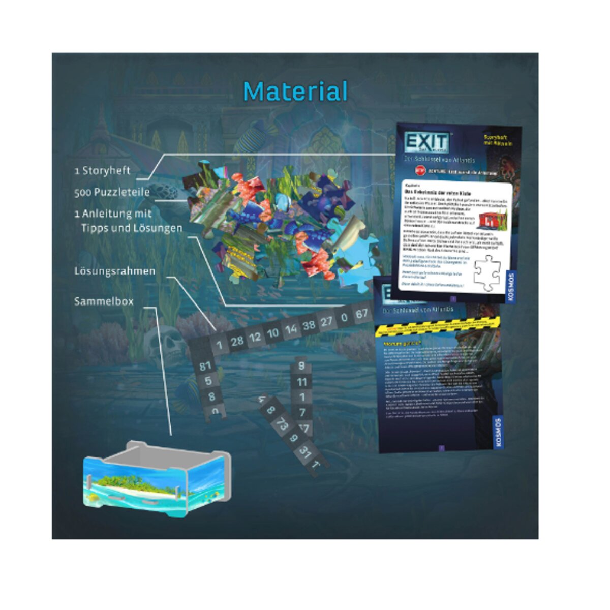 Taucht ab in die Tiefen des Ozeans und entdeckt das sagenumwobene Atlantis! Die 500 Teile des hochwertigen Puzzles eröffnen eine magische Unterwasserwelt mit bunten Meerestieren und versunkenen Schätzen. Eine Escape- Geschichte führt Puzzlerinnen und Puzzler ab 10 Jahren durch sieben abwechslungsreiche Rätsel. Gelingt es, im finalen Rätsel das große Geheimnis zu lüften und den Schlüssel zum Palast von Atlantis zu finden? Großer Spaß für Puzzlefans mit EXIT® - Das Puzzle.