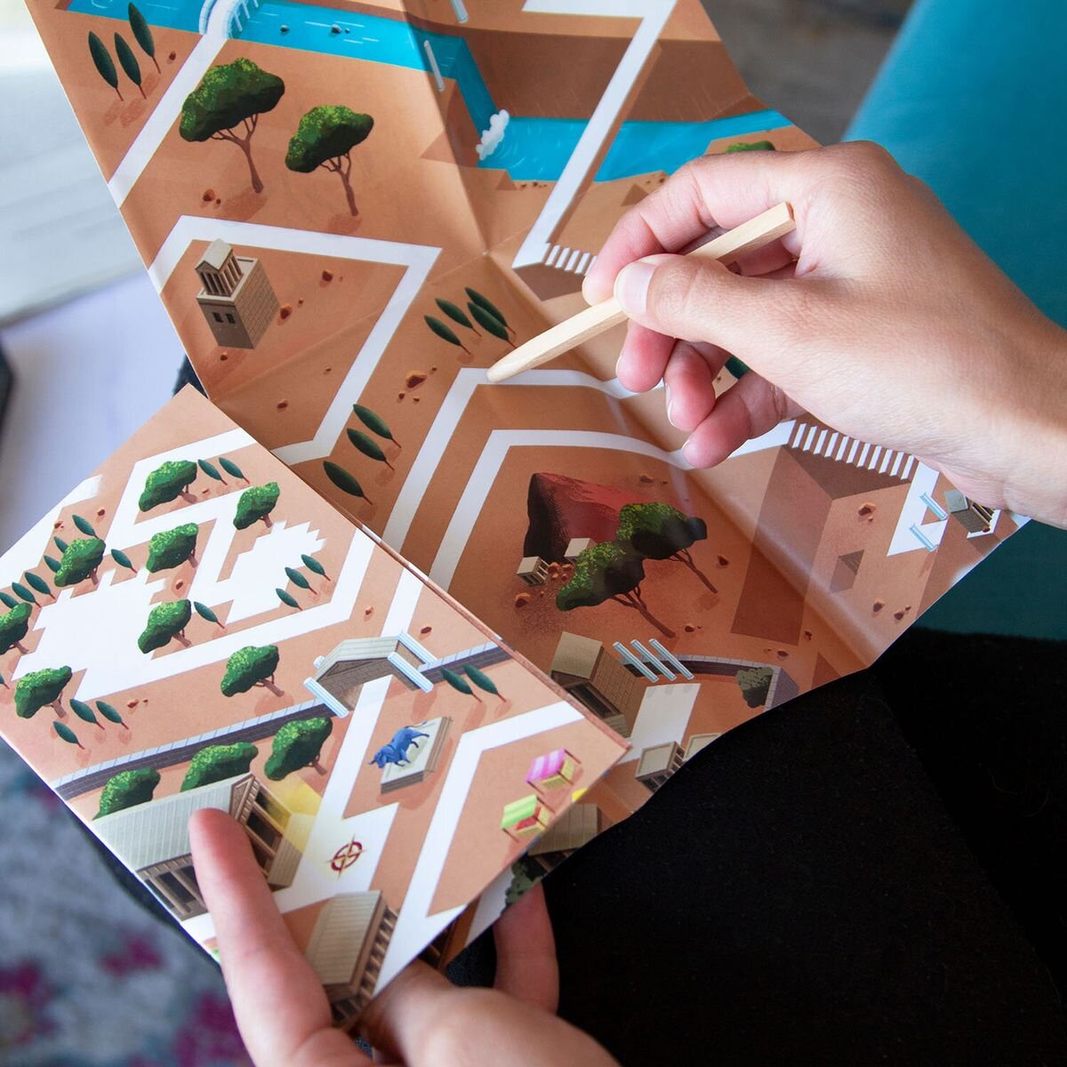 Inhalt: 7 Labyrinth-Faltkarten, 1 Holzstab, 1 Spielanleitung
