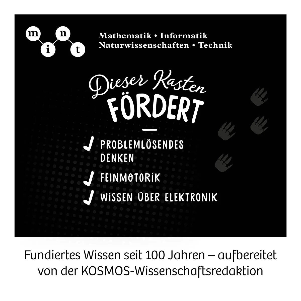 Wer brüllt denn hier? Der gigantische Rex ist der neue Bewacher im Kinderzimmer! Aus über 100 Einzelteilen bauen Kinder den 53 cm großen Dino zusammen, und schon können sie alle seine Funktionen testen: Ob er mit der Fernbedienung gesteuert oder programmiert wird, Rex brüllt, schmatzt, stampft und lässt gefährlich seine Augen aufleuchten. Besonders cool: im Wächtermodus nimmt Rex über seine Infrarot-Sensoren Bewegungen wahr und verjagt jeden, der ungebeten das Zimmer betritt! Gleich zwei Motoren sorgen dafür, dass er Beine, Arme und Maul bewegt, und bis zu 50 Aktionen können programmiert und auf Knopfdruck gestartet werden. Die Anleitung erklärt die verschiedenen Funktionen und führt Schritt für und Schritt und mit farbigen Bildern durch den Aufbau. Auf geht’s, mit Gebrüll!