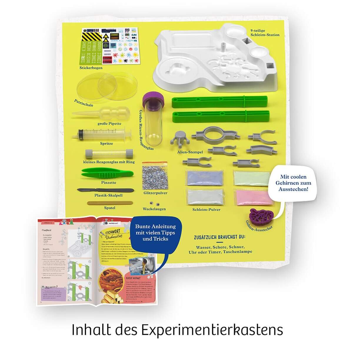 Inhalt: Verschiedene Schleimsorten, Ausstecher, Tubes, Alien-Stempel, Schleim-Station, Glitzerpulver, Wackelaugen, Skalpell, Pinzette, Pipette, Spritze, Sticker-Bogen