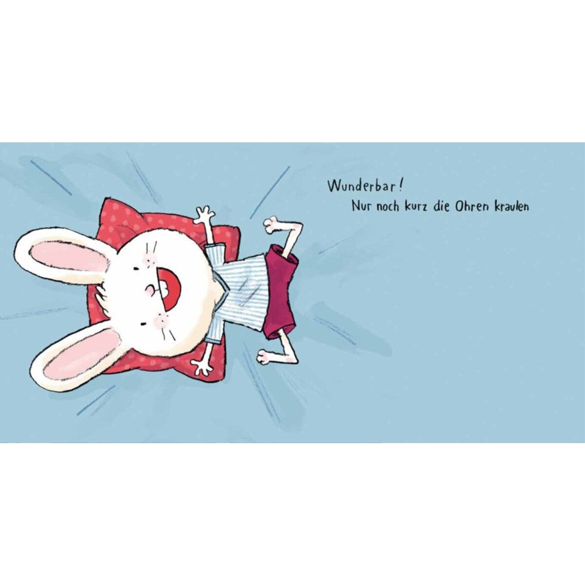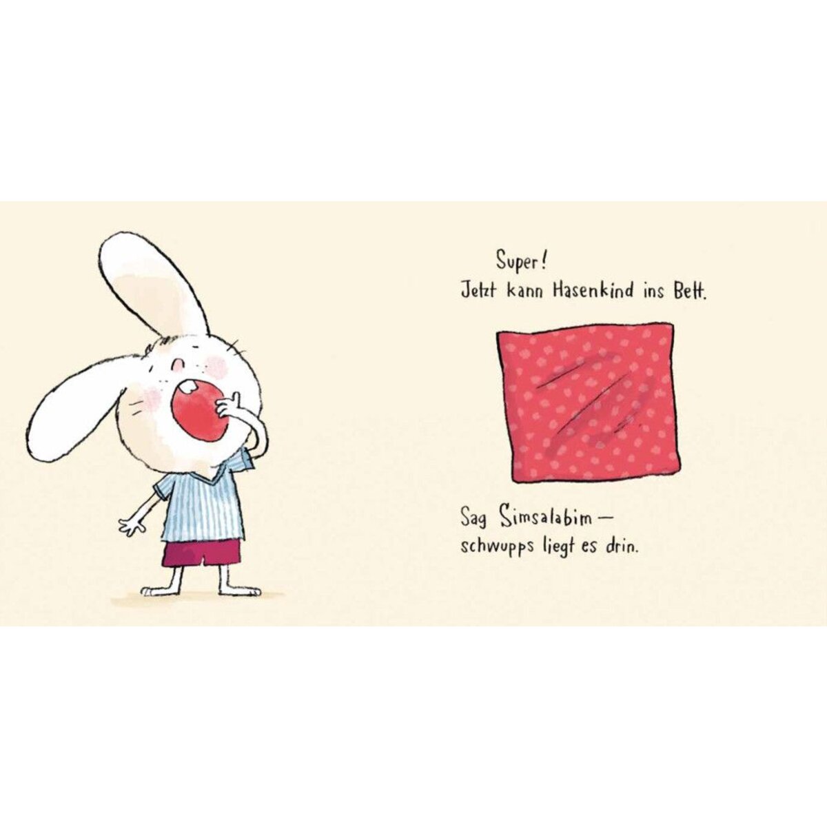 Die Zähne sind geputzt, der Schlafanzug liegt bereit. Klatsch in die Hände - schon hat Hasenkind ihn an. Jörg Mühle hat sich ein wunderbares Ritual ausgedacht, mit dem Hasenkind ins Bett gebracht wird: Händeklatschen, Kissen zurechtklopfen, Simsalabim sagen, Ohren kraulen, Rücken streicheln, gut zudecken und schließlich den Schlaf-gut-Kuss geben. Bis es dann auf der letzten Seite heißt: Mach bitte auch noch das Licht aus. Hier ist der Schalter.