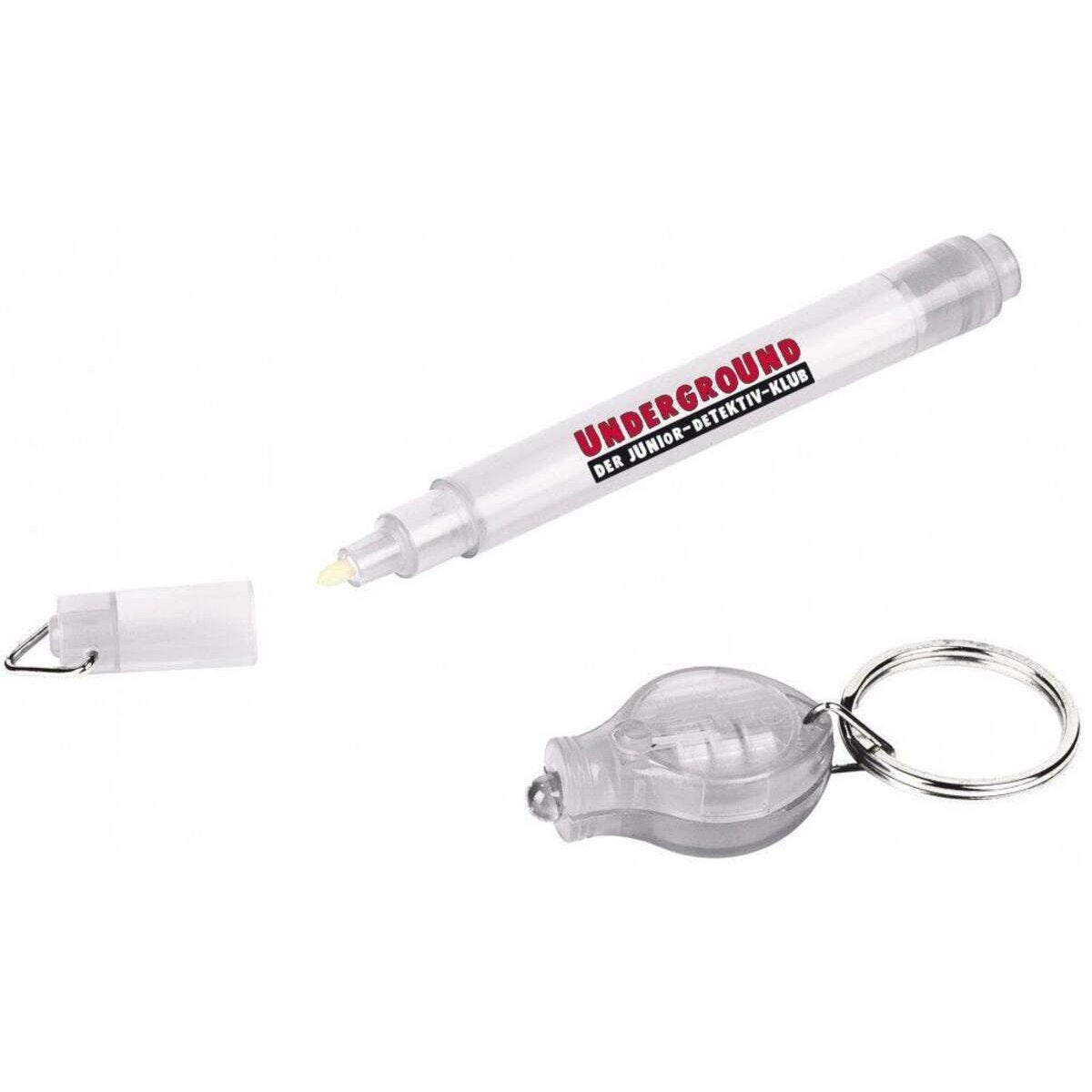 Geheimcodestift mit unsichtbarer Tinte und UV-Licht. Zum Austauschen geheimer Botschaften und Nachrichten. Das UV-Licht lässt das Geschriebene wieder erscheinen.