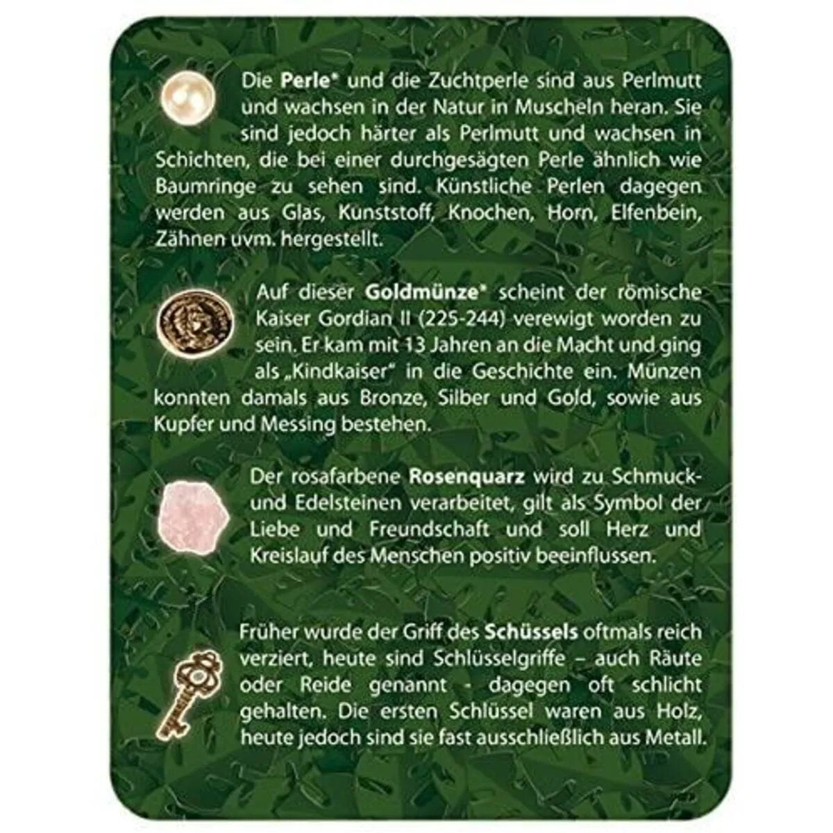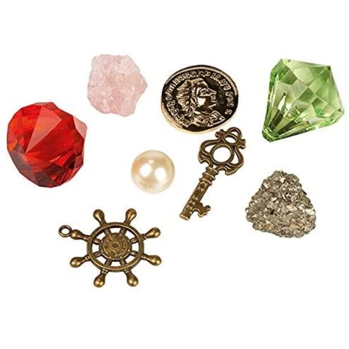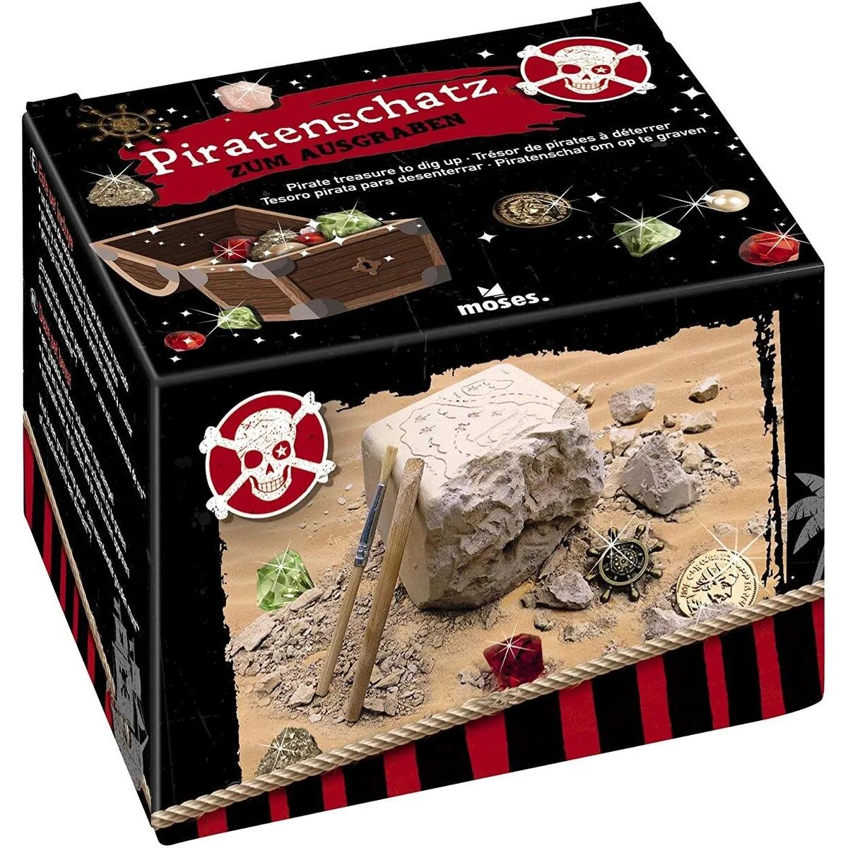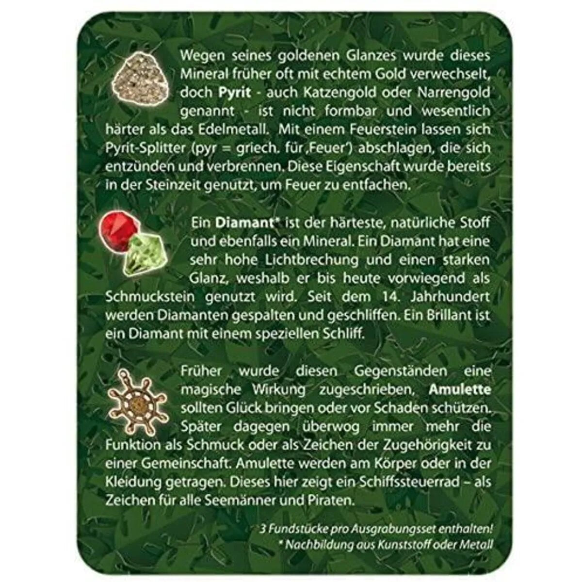Für kleine Piraten und Entdecker - dem Abenteuer auf der Spur! Im Gipsblock mit geprägter Schatzkarte sind 3 tolle Ausgrabungsobjekte verborgen. Mit Ausgrabungswerkzeug und Infokarte zu den möglichen Ausgrabungsobjekten (Goldklumpen aus Pyrit, Rosenquarz, Kunststoffdiamant, Perle, Goldmünze, Amulett oder Schlüssel aus Metall).