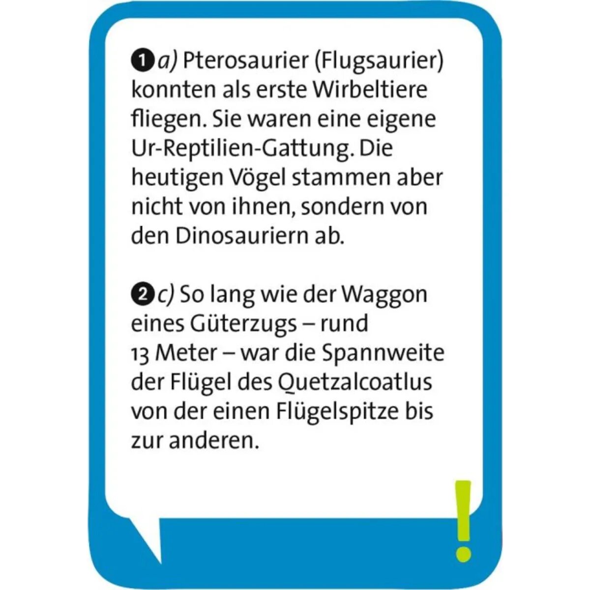 Willkommen im Reich der Urzeitgiganten! Wie lange waren Dinosaurier die Herrscher der Welt? Was bedeutet eigentlich das Wort „Dinosaurier“? Und welcher Dino war der Schnellste? Mit diesem spannenden Quiz können Kinder tief in die geheimnisvolle Welt der Dinosaurier eintauchen und ihr Wissen mit 100 Fragen rund um T-Rex, Kreidezeit und Co. testen.