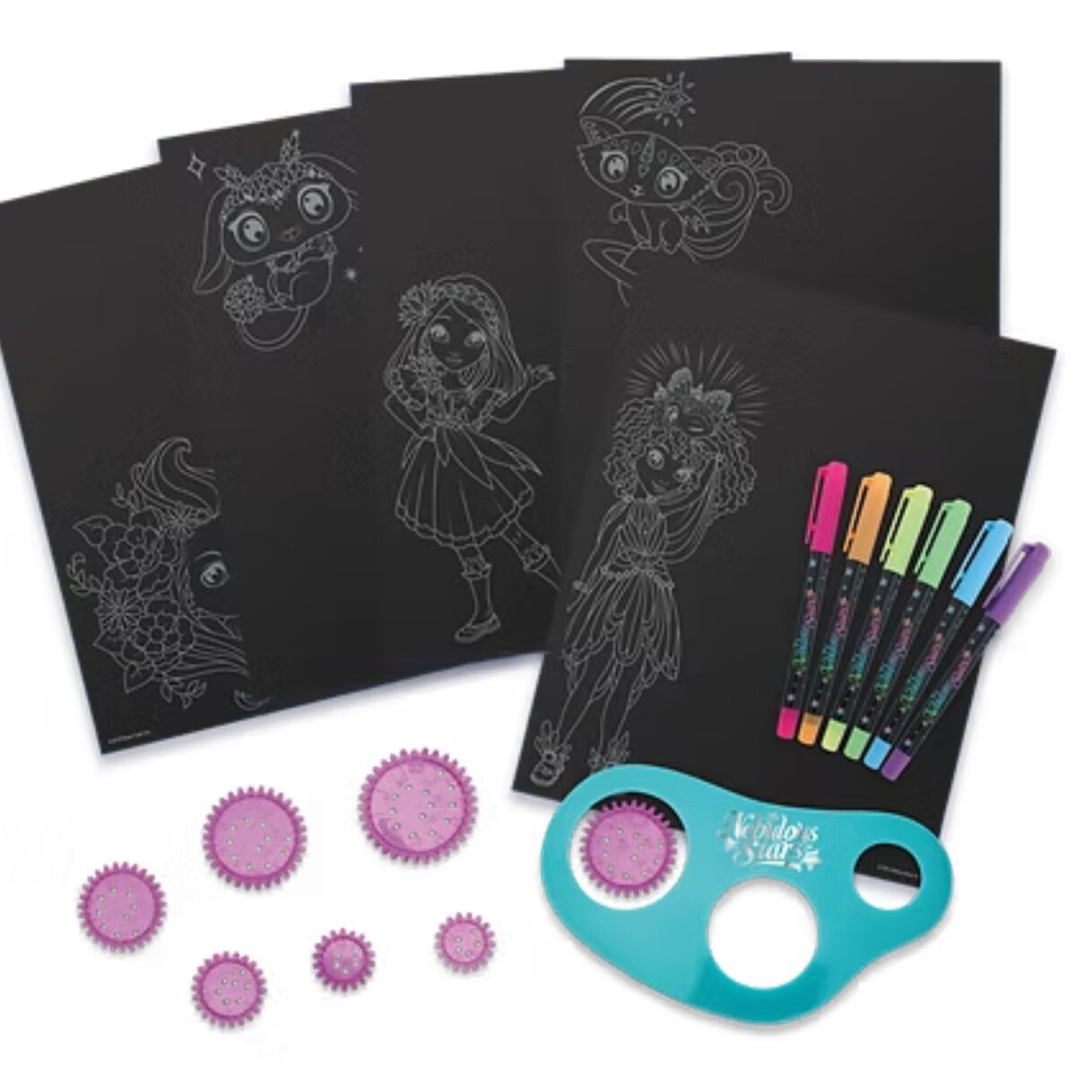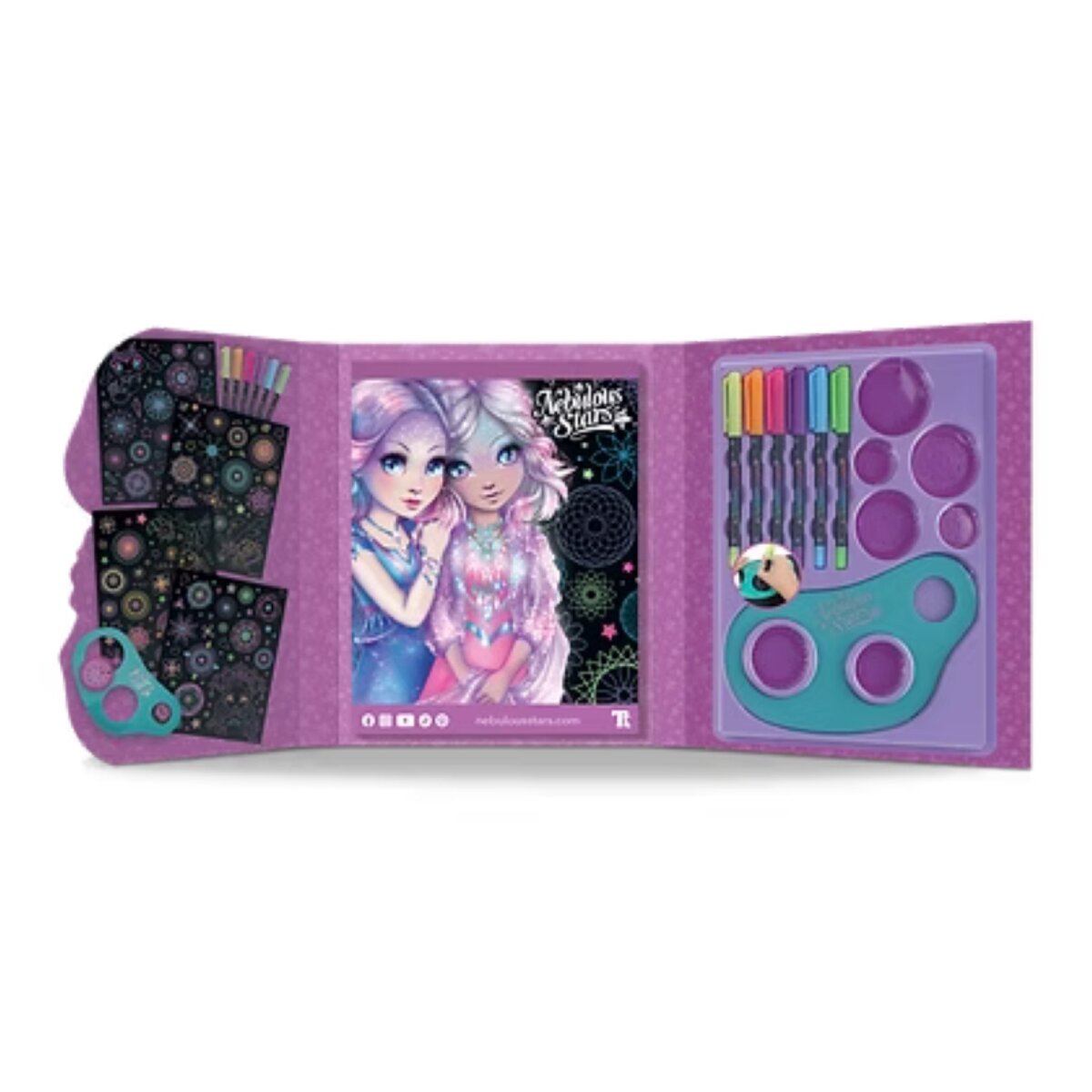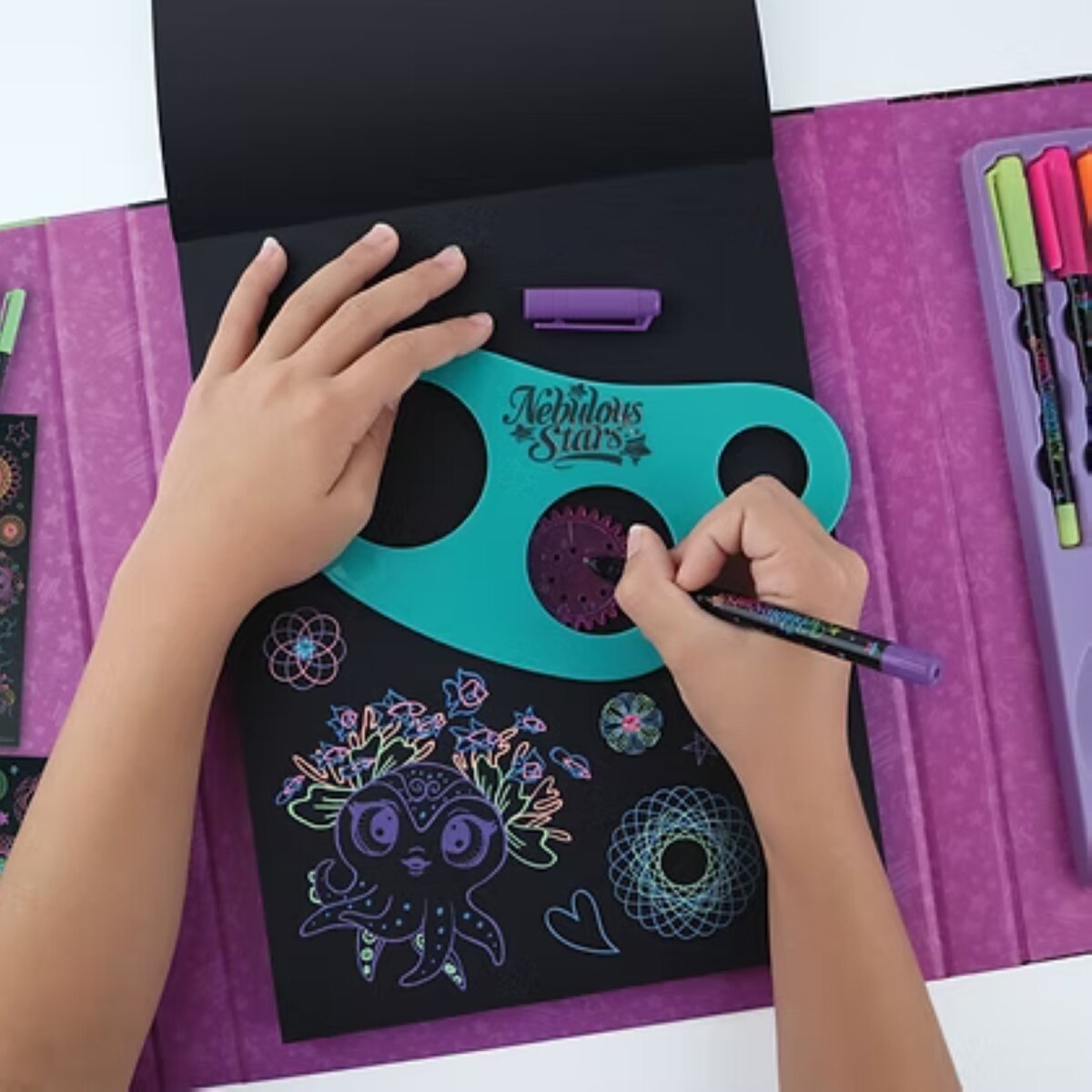 Das klassische Spiralen-Muster hebt ab in neue Sphären! Mit dem Swirl-Studio „Stars in Action“ erschaffst du leuchtende, galaktische Kunstwerke rund um deine Lieblingsstars – und das mit stylischen Neonfarben, schimmernden Stickern und jeder Menge Kreativität.