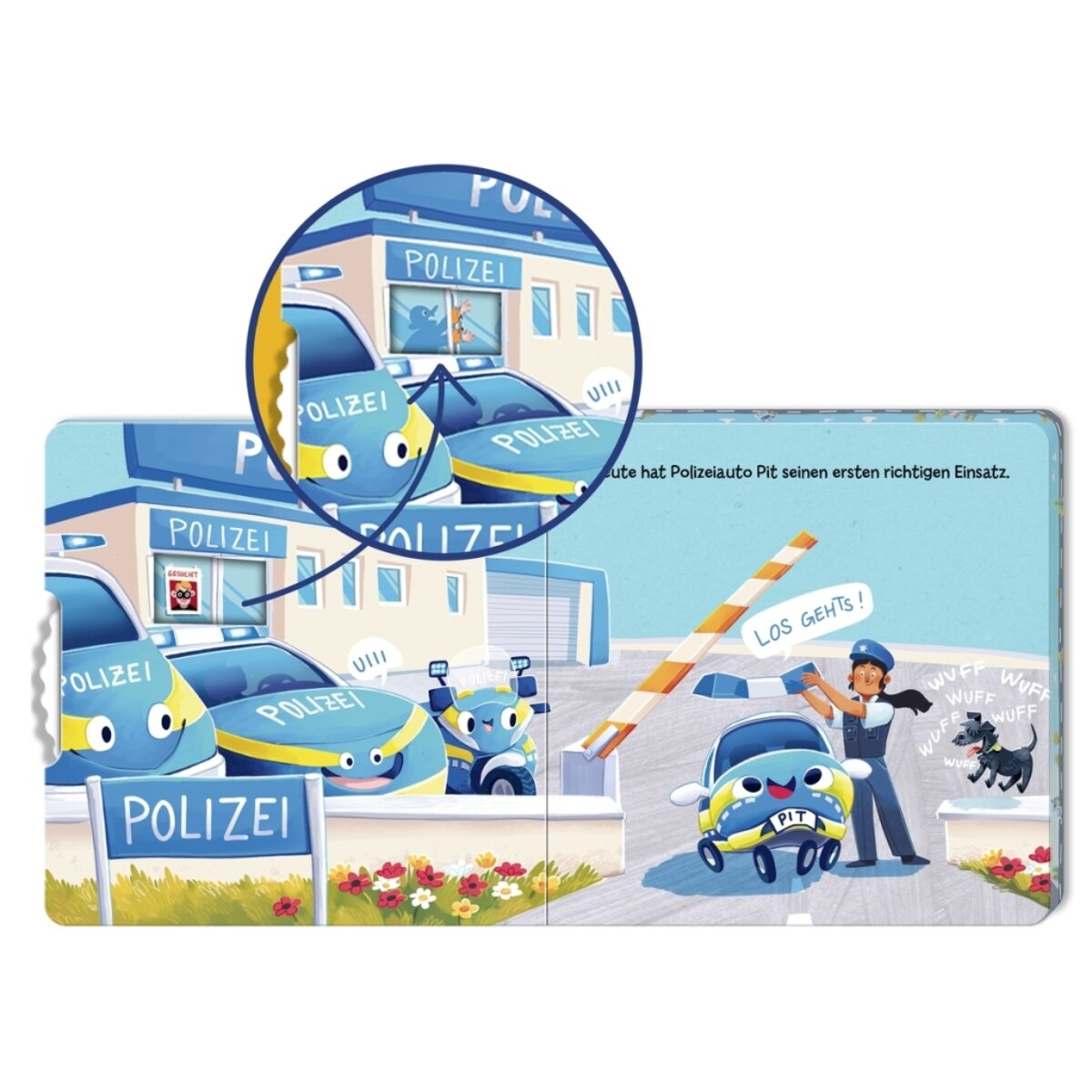 Polizeiauto Pit hat heute seinen ersten Tag auf der Wache. Mit Blaulicht und Sirene startet er durch! Die Abenteuer warten schon: Erst muss er einem verirrten Autokind helfen, dann schon regelt er den Verkehr nach einem Unfall. Das Drehrad sorgt für zusätzlichen Spaß beim Entdecken des Polizeialltags.