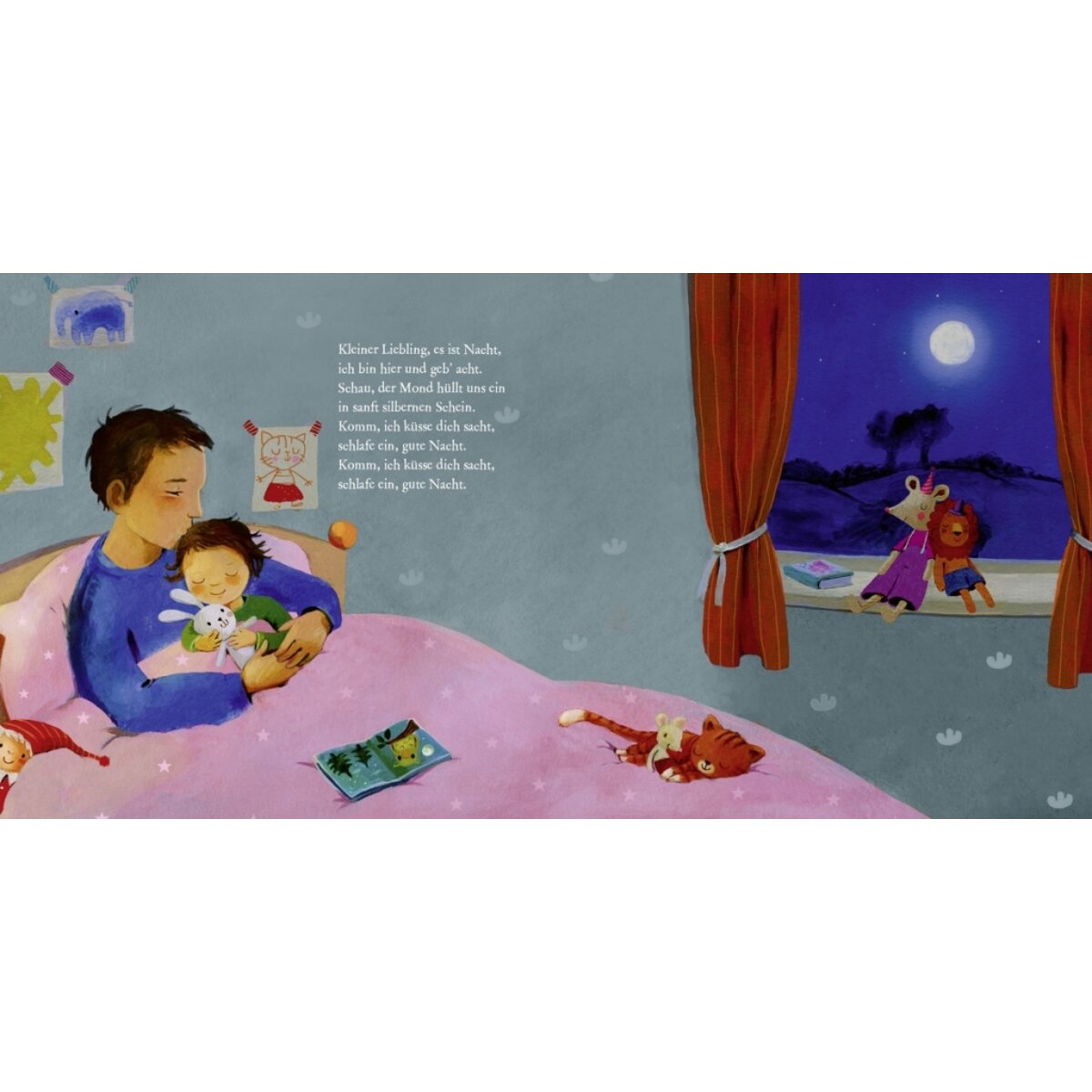 Dieser liebevolle Sammelband ist ein wunderbares Gute-Nacht-Buch für Kinder ab 18 Monaten. Seine drei herzerwärmenden Geschichten eignen sich perfekt für kuschelige Einschlafrituale. Sei es die kleine Maus, die sich die Zähne putzt, den Schlafanzug anzieht und auf den Gute-Nacht-Kuss wartet, die kleine Fledermaus, die vor dem Zubettgehen ihr liebstes Kuscheltier sucht oder liebevolle Einschlafreime, die man zur Melodie von „Guten Abend, gut Nacht“ vorsingen kann: Jede Gute-Nacht-Geschichte steckt voller Wärme und Geborgenheit und lässt die Kleinen wohlig und sanft einschlummern.