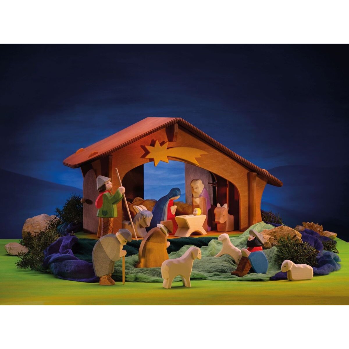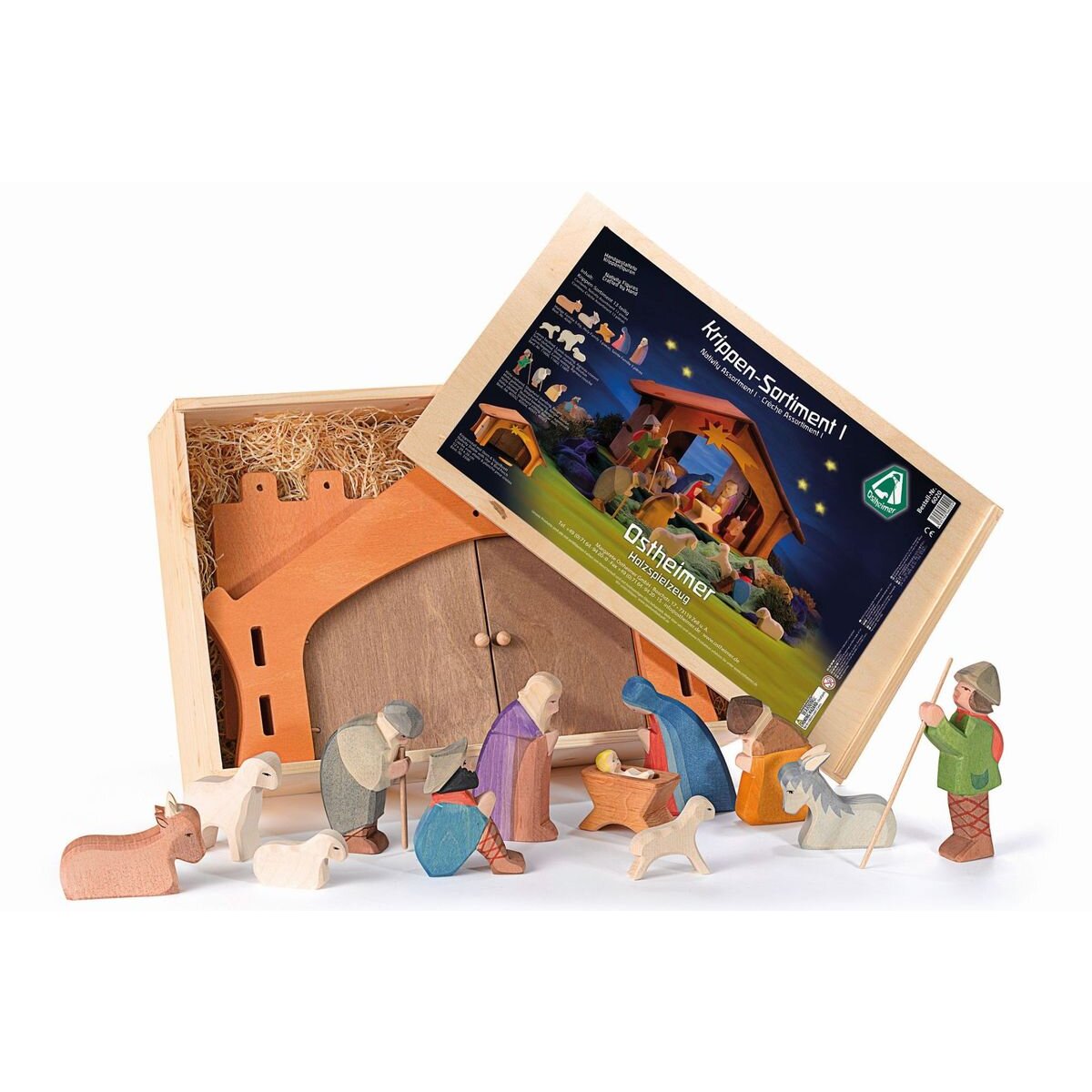 Die komplette Weihnachtsszene! Inhalt: Maria, Josef, Krippe mit Kind, Ochse, Esel, Hirte kniend, stehend, sitzend und gebeugt, Schaf stehend, Lamm liegend und laufend, Krippenstall mit Stern und Vogelbrett.