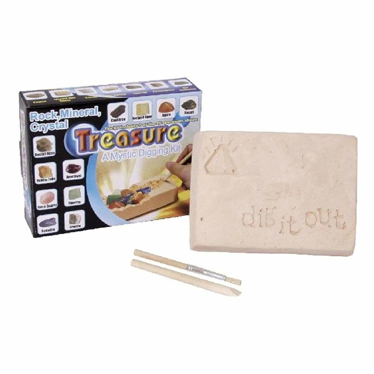 Inhalt: 1 Gipsblock mit 5 eingebetteten Edelsteinen, 1 Pinsel, 1 spezielles Grabwerkzeug und 1 Anleitung.