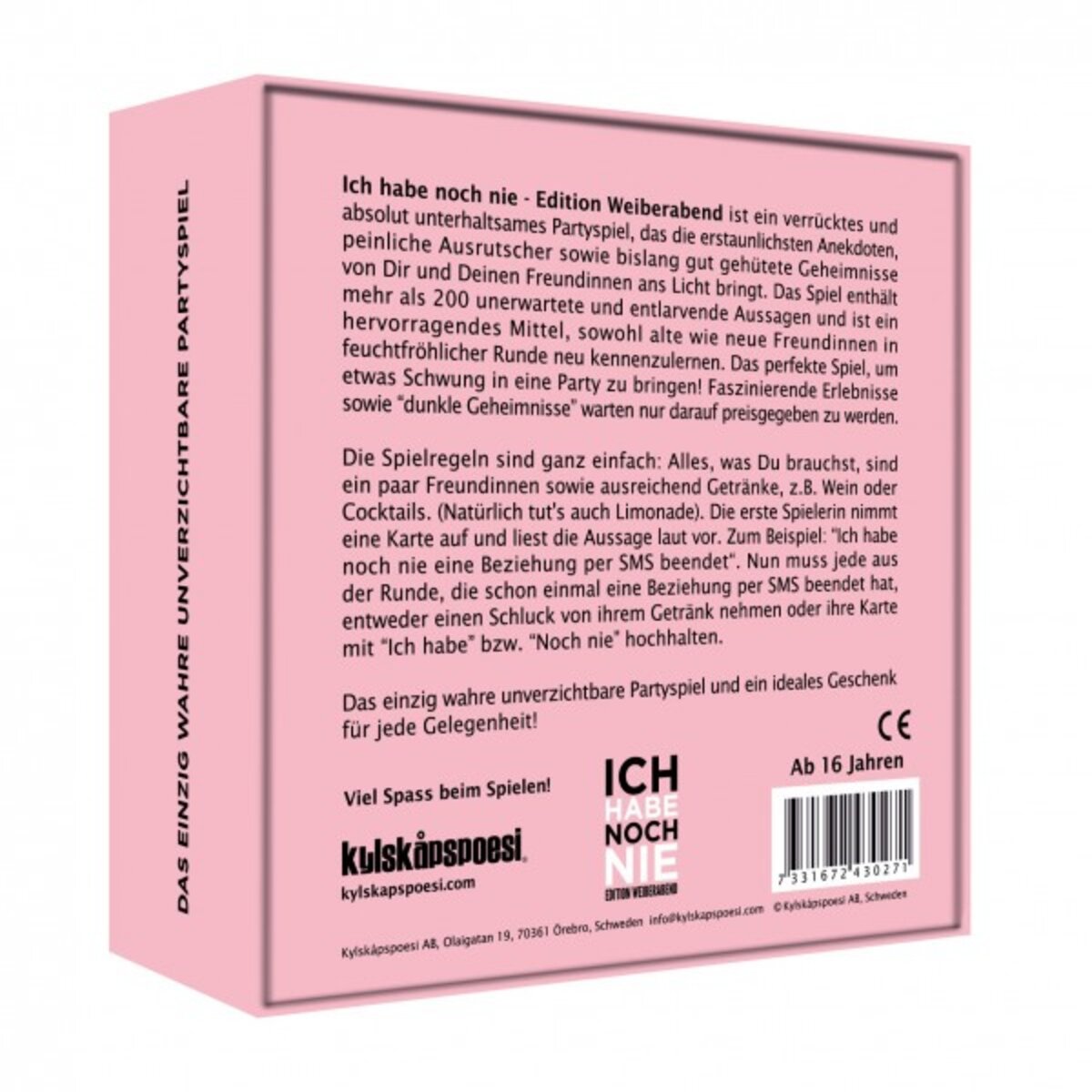 Das einzig wahre unverzichtbare Partyspiel Ich habe noch nie ist ein verrücktes und absolut unterhaltsames Partyspiel, das die erstaunlichsten Anekdoten, peinliche Ausrutscher sowie bislang gut gehütete Geheimnisse von Dir und Deinen Freundinnen ans Licht bringt. Ich habe noch nie… Weiberabend enthält mehr als 200 unerwartete und entlarvende Aussagen und ist ein hervorragendes Mittel, sowohl alte wie neue Freundinnen in feuchtfröhlicher Runde neu kennenzulernen. Das perfekte Spiel, um etwas Schwung in eine Party zu bringen! Faszinierende Erlebnisse sowie “dunkle Geheimnisse” warten nur darauf, preisgegeben zu werden.